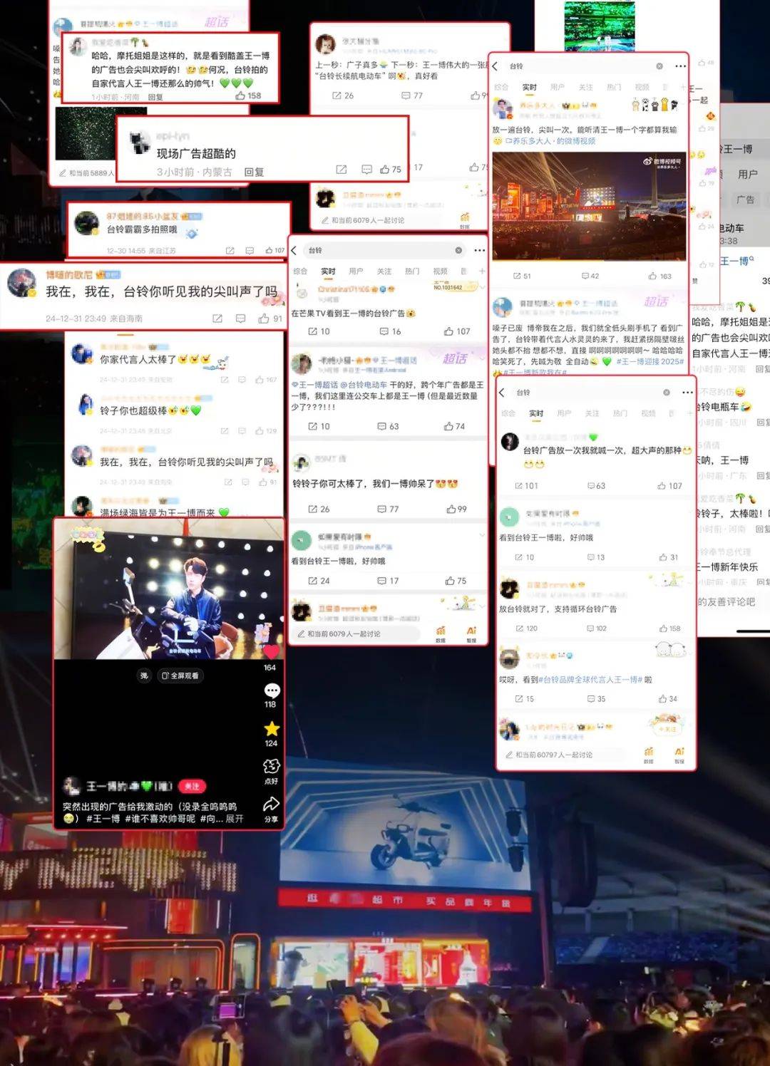 同時在抖音、微博、小紅書等各大平臺,眾多王一博粉絲紛紛表示在跨年晚會看到臺鈴廣告大片萬分激動。“臺鈴廣告出來一次尖叫一次”、“為了給臺鈴牌面嗓子已廢”、“放臺鈴廣告就對了支持循環(huán)臺鈴廣告”,類似的評論層出不窮、瘋狂刷屏,占據(jù)全網(wǎng)話題C位。