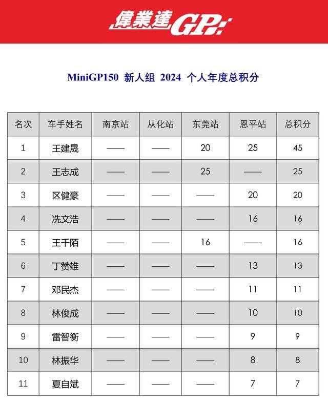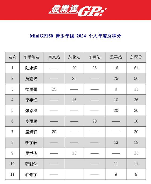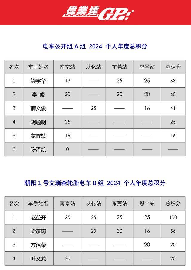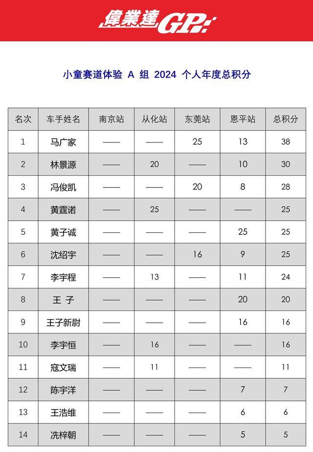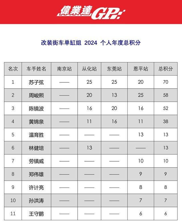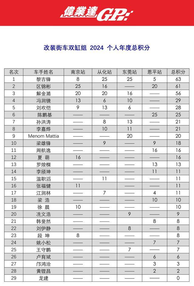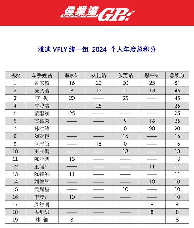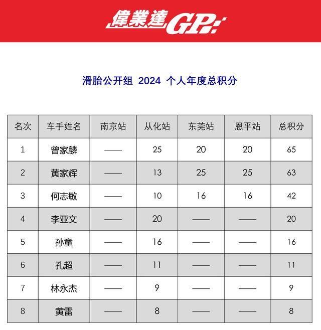 下面的圖片,偉業(yè)達(dá) GP 各競(jìng)賽組別 2024 個(gè)人年度積分榜: