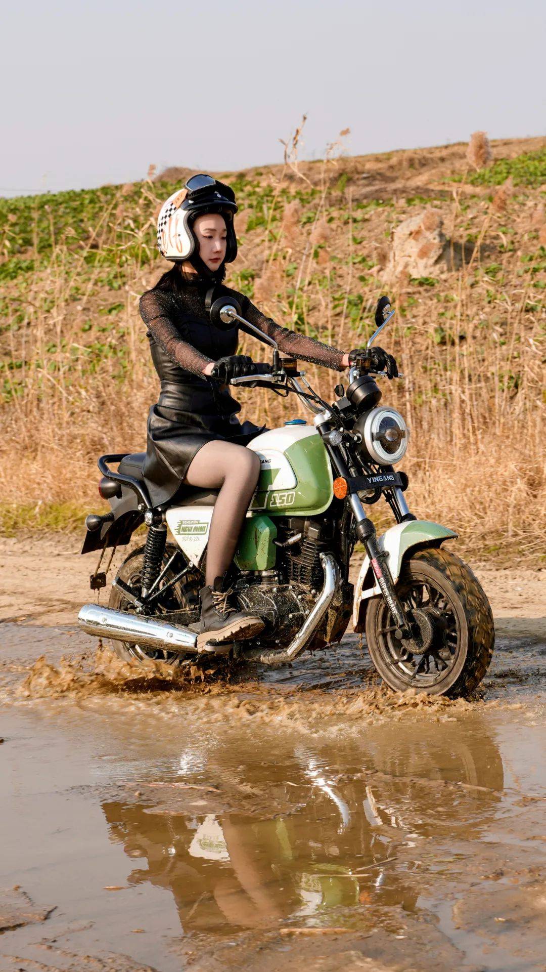 全地形胎,抓地杠杠滴,這種看起來很惡劣的土路、涉水路,穩(wěn)住車把、小油門輕松過,抓地OK,車身穩(wěn)穩(wěn)的。