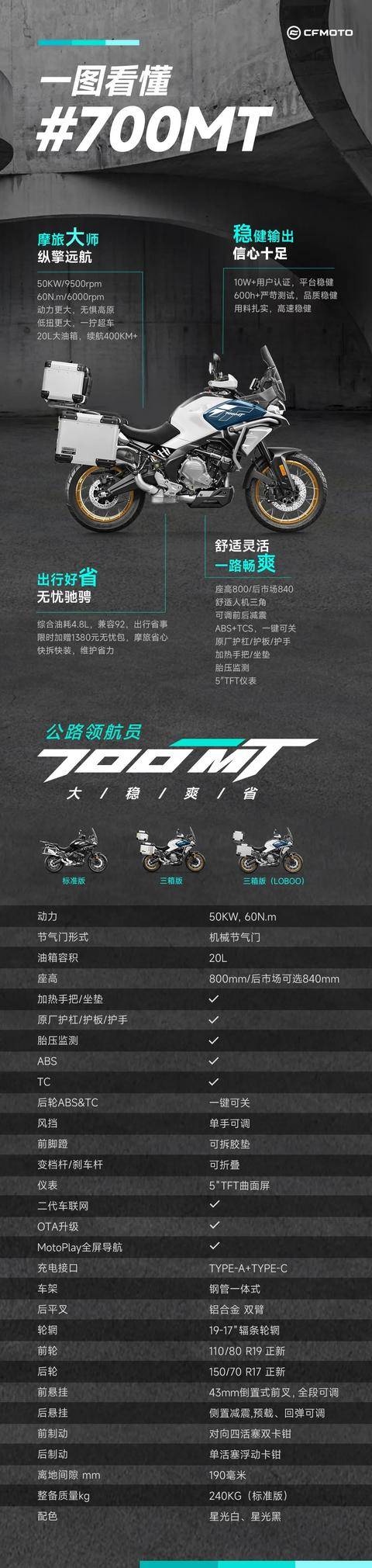 春風(fēng)700MT還配備了5英寸曲面TFT儀表,強(qiáng)光下清晰可見,功能豐富實(shí)用,APP支持MotoPlay自動(dòng)連接和全屏導(dǎo)航,導(dǎo)航、聽歌、通話功能三不誤。支持整車OTA升級(jí)、定位尋車、電子圍欄等功能,一個(gè)CFMOTOAPP全搞定。此外支持一鍵關(guān)閉ABS+TCS。風(fēng)擋調(diào)節(jié)范圍為5厘米,還自帶手把平衡桿與手機(jī)支架,方便用戶加裝設(shè)備。這些智能配置不僅提升了駕駛的便利性,也為長(zhǎng)途探險(xiǎn)提供了有力支持。