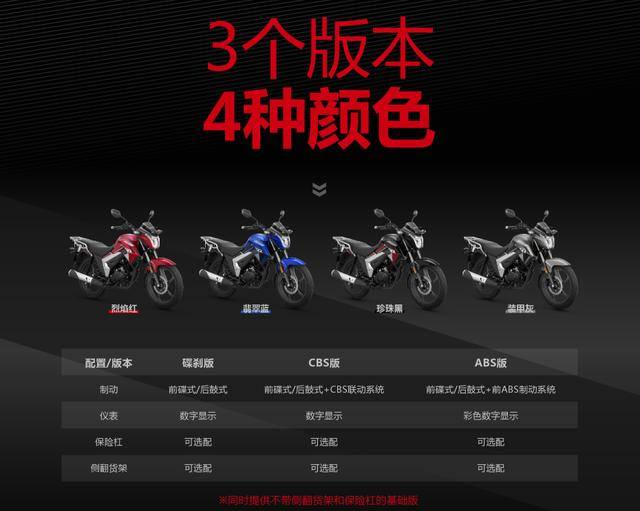 此外,CB150S還配備了前輪ABS系統(tǒng),在濕滑或復(fù)雜路況下,進(jìn)一步提升了車輛的安全性能。原車自帶后貨架,可選配原裝的堅(jiān)固保險(xiǎn)杠以及結(jié)實(shí)的折疊大腳踏板,來實(shí)現(xiàn)更大的車身裝載能力。CB150S也推出了碟剎版、CBS版、ABS版三個(gè)版本,四種配色,以供用戶自由選擇。