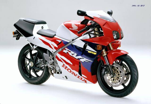 7、屬于 400 cc 級別第五代 V4 車型(前四代分別為 NC13、NC21、NC24、NC30)的 RVF(RVF400RR,工廠編號 NC35)在 1994 年一月首次發(fā)布。該車搭載最后一代的 NC13E 發(fā)動機,型式上仍為盡可能降低一次振動的 V 型 90 度設(shè)計,四氣缸、DOHC 每氣缸四氣閥,缸徑、行程保持不變,配氣結(jié)構(gòu)的進氣口內(nèi)徑和形狀經(jīng)過更新,進氣歧管修改為前后不規(guī)則形狀的設(shè)計,以進一步提高進、排氣效率。此外,六檔變速齒輪箱的 1 到 3 檔采用了低減速比的設(shè)計,讓騎行變得更具運動感 —— 該設(shè)計更多的是為了彌補當?shù)胤ㄒ?guī)的編號、峰值馬力被降到 53 匹之后 “ 運動感的損失 ”;
