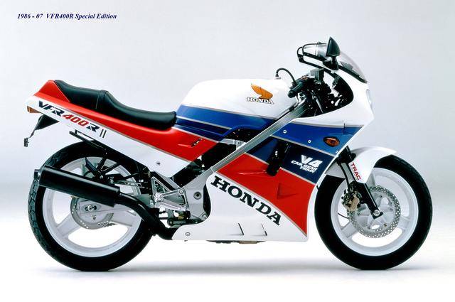 3、第一代的 VFR400R、VFR400Z 僅僅維持了一年,隨即被新一代的 1987 VFR400R(工廠編號 NC24)所代替。這一新的 VFR400R 有一個重要的標志性變化:換裝了他們在 1984 - 1986 WEC 世界耐力錦標賽里獲勝之工廠機器 RVF750 相同技術(shù)理念的、可實現(xiàn)快速更換后輪的最新裝備 —— 后單搖臂。這是 VFR400R 首次配備了后單搖臂,此外還有首次成為標準配置的浮動式雙前剎車碟。而沿用的 NC13E 發(fā)動機經(jīng)過重新調(diào)校,廠方將其稱之為 “ 與在 MFJ 全日本公路賽錦標賽 TT-F3 里面、取得壓倒性優(yōu)勢的工廠賽車 RVF400 同型的量產(chǎn)規(guī)格機器 ”,并換裝了 32 mm 的化油器,“ 由此,從低轉(zhuǎn)速到高轉(zhuǎn)速區(qū)域都發(fā)揮出敏捷、響應(yīng)性優(yōu)異且強而有力的輸出特性 ”;