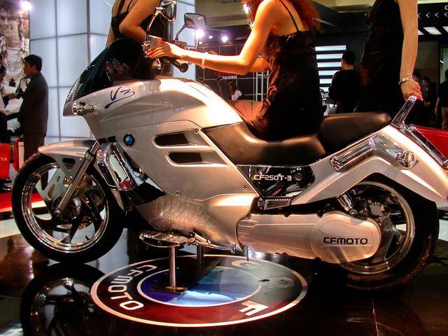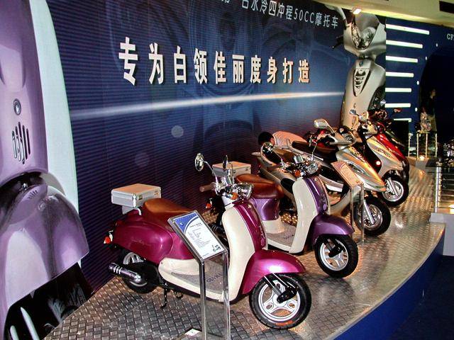 下面的圖片,2004 年廣州車展的春風(fēng)摩托展臺(tái)。
