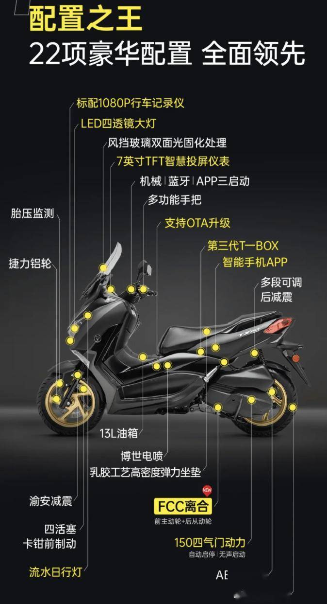 在車(chē)輛規(guī)格方面,2025款TX150的長(zhǎng)寬高分別為1975x770x1243毫米,軸距達(dá)到1360毫米,確保了良好的操控性和乘坐舒適性。座高設(shè)定為755毫米,整備質(zhì)量為150公斤。車(chē)輛配備了一系列先進(jìn)的配置,包括內(nèi)置行車(chē)記錄儀、胎壓監(jiān)測(cè)系統(tǒng)、多段可調(diào)后減震器、四活塞前剎車(chē)系統(tǒng)以及雙通道ABS和TCS牽引力控制系統(tǒng),為騎行安全提供了全方位保障。