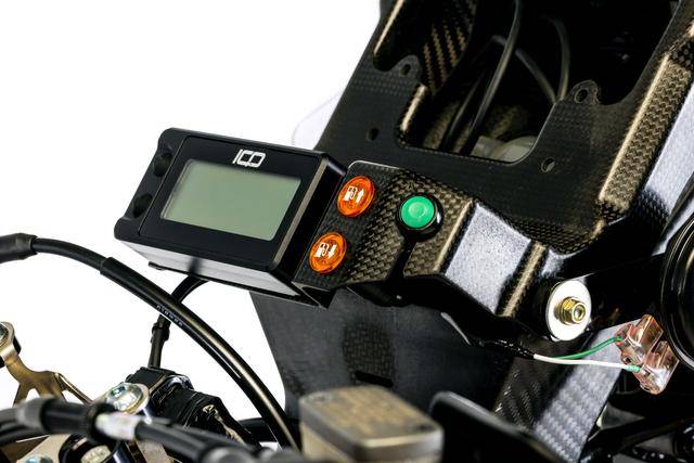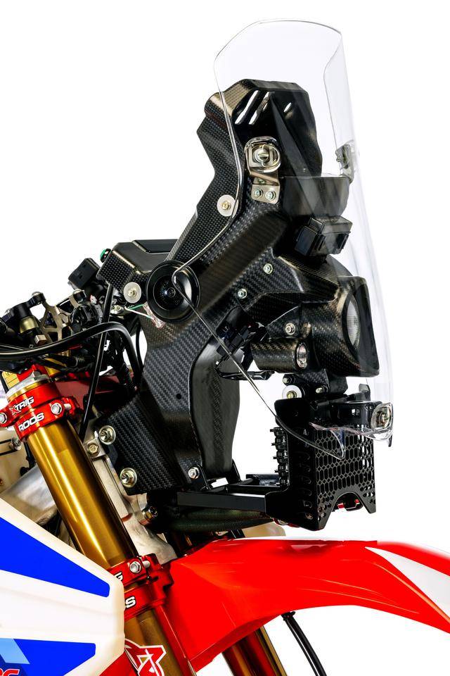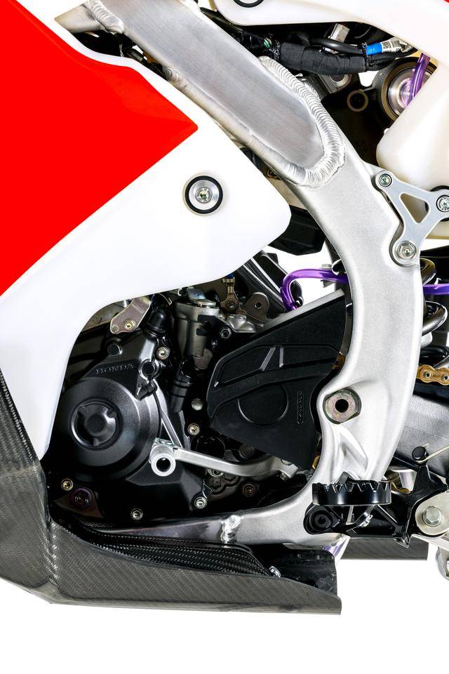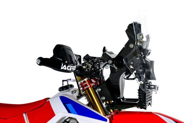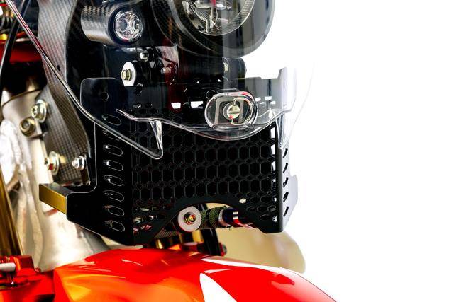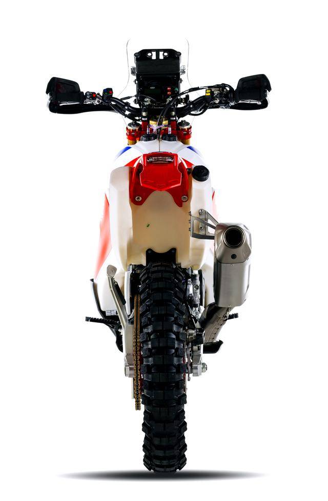 1、基于市售越野賽車 CRF450R 改造而成,搭載一副水冷四沖程單氣缸、SOHC 四氣閥(Unicam)的發(fā)動(dòng)機(jī),為了保證高度的可靠性,機(jī)器針對(duì)拉力賽的應(yīng)用環(huán)境作了對(duì)應(yīng)的改造,峰值馬力輸出約為 58 匹(MX 場(chǎng)地越野賽車規(guī)格的 CRF450R、最大馬力輸出超過(guò) 60 匹),換裝了有著長(zhǎng)傳動(dòng)比的六檔變速齒輪箱(原廠標(biāo)準(zhǔn)規(guī)格的 CRF450R 采用五檔的齒輪箱);