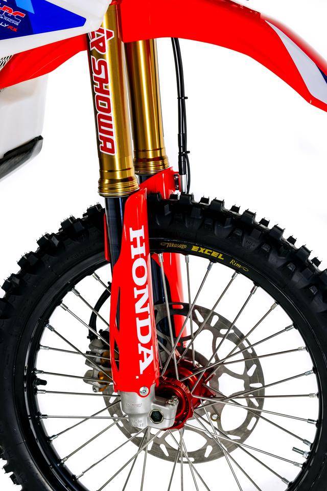 10、由 HAAN 特別開發(fā)、以實(shí)心材料經(jīng)過(guò) CNC 加工而成的前后輪轂;來(lái)自 Excel 前 21(1.6 x 21)、后 18 英寸(2.5 x 18,CRF450R 為 2.15 x 19、CRF450RX 為 2.15 x 18)輪框和輻條,帶有防護(hù)裝置、以吸收來(lái)自比賽過(guò)程中的猛烈撞擊,可提高駕駛的舒適性,從而減少了車手長(zhǎng)途飛馳的疲勞;