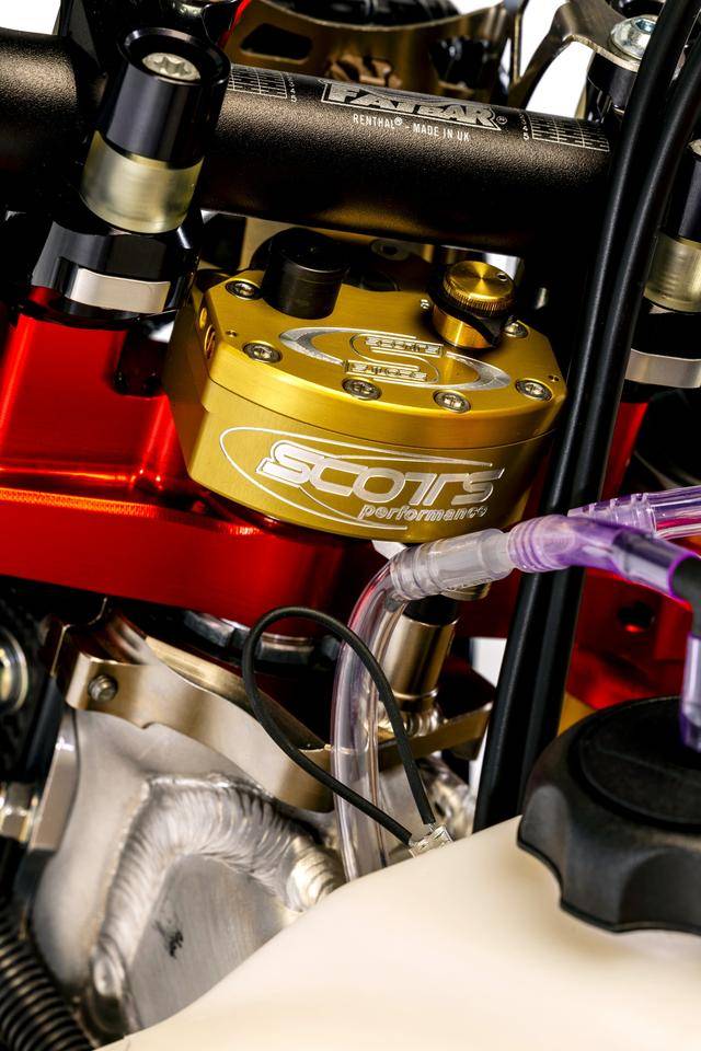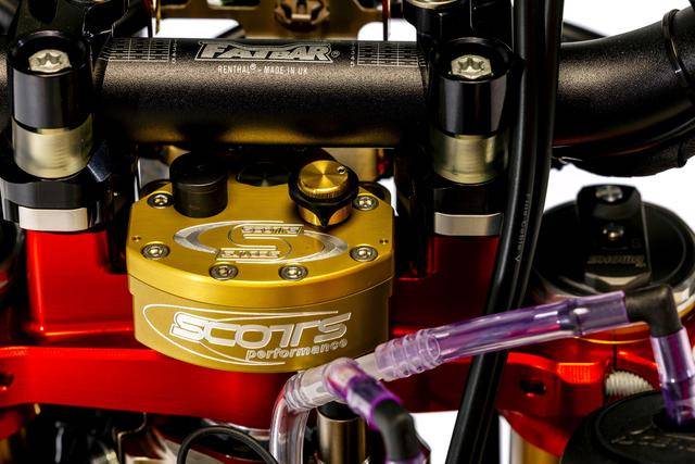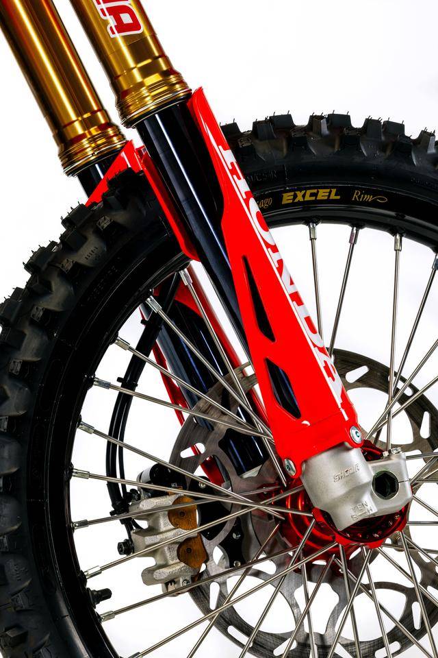 5、基于 CRF450R 的鋁合金制雙翼樑式車架,Showa 配套的賽車懸掛系統(tǒng),前面是叉芯口徑為 49 mm、帶特殊涂層、行程為 310 mm 的倒立式前叉,后面是 Pro-link 多連桿聯(lián)接的單筒式后減震;
