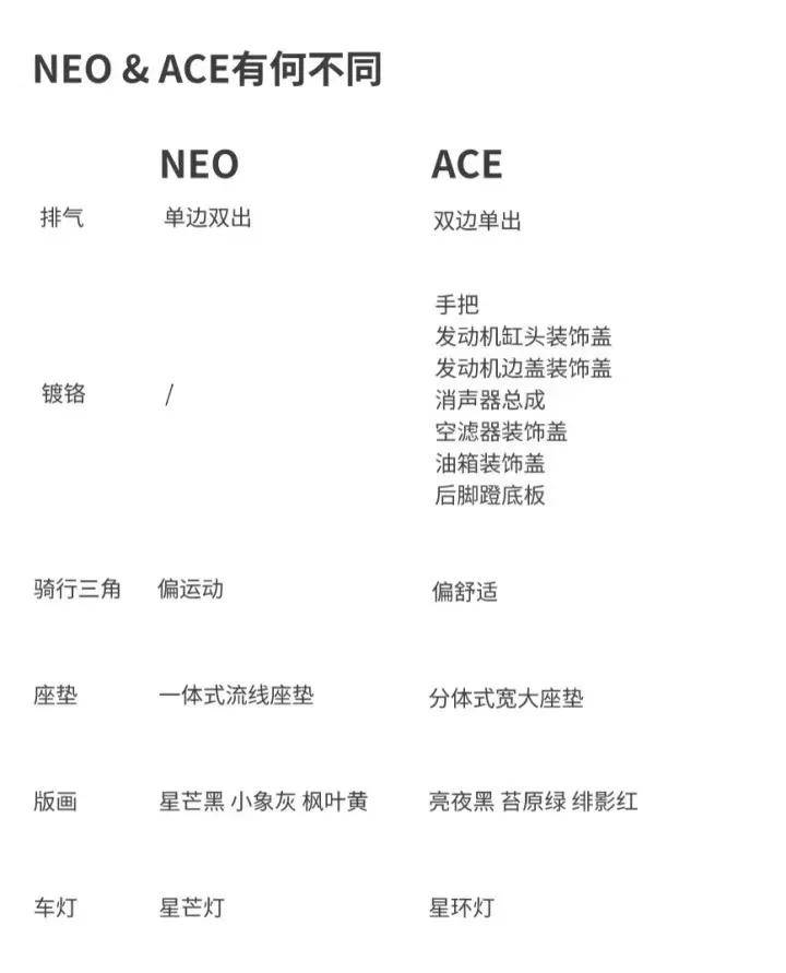 *NEO版:偏向“新潮、運動、活力”,偏運動感的騎行三角,配備單邊雙出黑色排氣、爪型大燈與分體式動感座墊,車身線條更具侵略性,貼合年輕用戶的個性化需求。