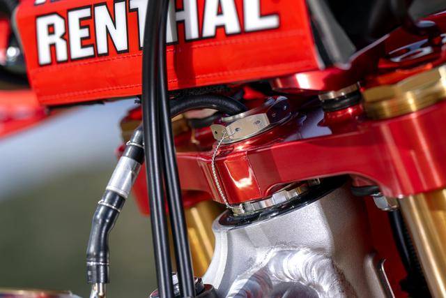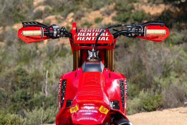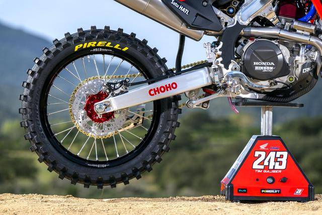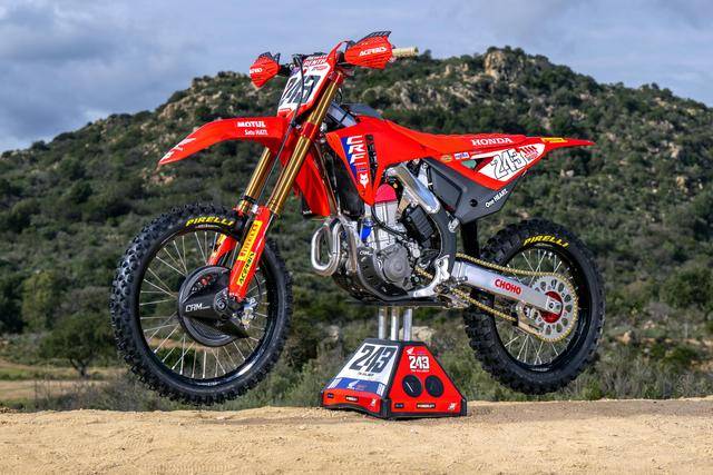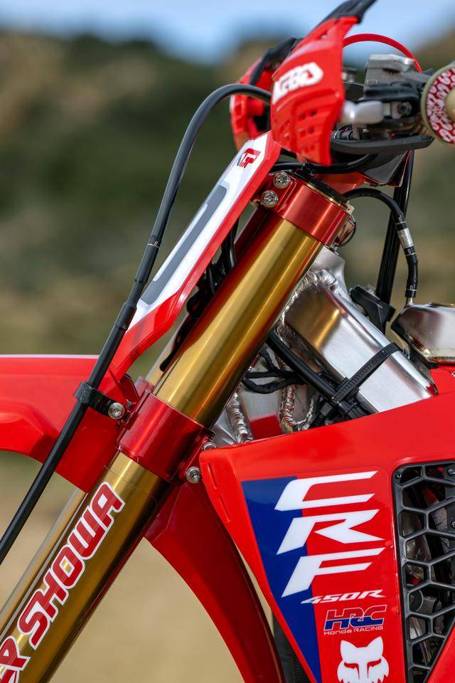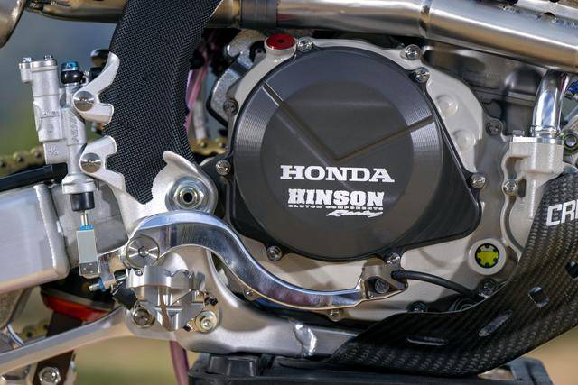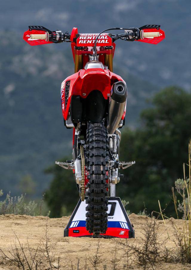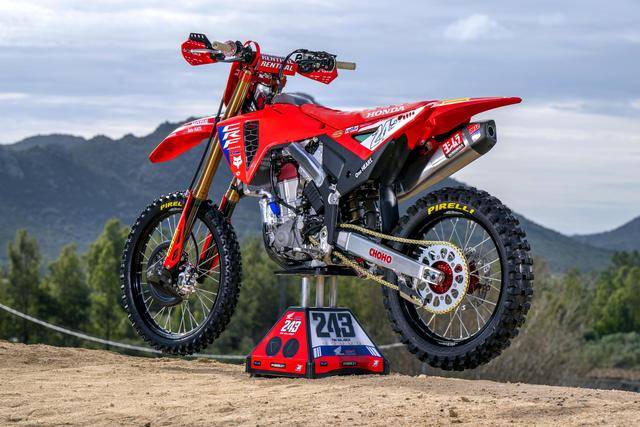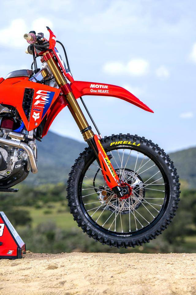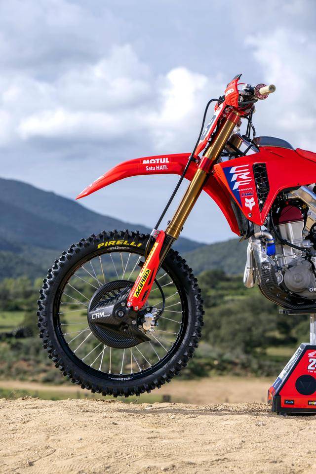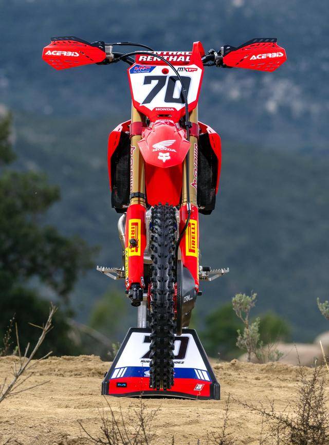 Honda 在 MXGP 里面的工廠賽車 CRF450RW,基礎(chǔ)車來自市售越野賽車 CRF450R,搭載一副水冷四沖程單氣缸、SOHC 四氣閥(Unicam)的發(fā)動機,缸徑、行程為 96 mm x 62.1 mm,排氣量 449.7 cc,五檔的變速齒輪箱。車體采用一副鋁合金制的雙翼樑車架,前 21、后 19 英寸直徑的車輪等。