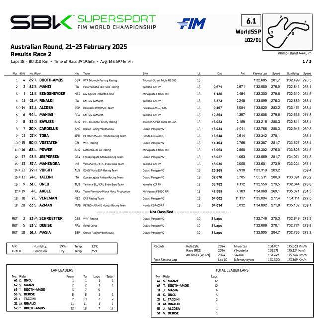 第二節(jié)的比賽,大部分時(shí)間里、冠軍爭(zhēng)奪戰(zhàn)都是寸土必爭(zhēng)的肉搏。阿莫斯最終奪得了第一,為凱旋摩托拿到了在 WorldSSP 里面的第二次勝利;曼茲落后 0.671 秒獲得了第二,駕駛 11 號(hào)車(chē)的荷蘭車(chē)手本施耐德(Bo Bendsneyder)拿到了第三。