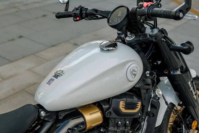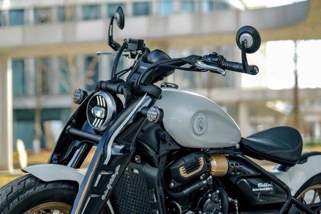RA600的外觀設(shè)計(jì)獨(dú)具特色,在BOBBER的基礎(chǔ)上融合了部分改裝風(fēng)元素,打破了大家對(duì)以往英倫巡航車的認(rèn)知。RA600采用了頗具“肌肉感”的車身設(shè)計(jì),緊湊的車身布局,有未來(lái)感的大燈燈組,寬幅手把、懸浮單人坐墊,鏤空式的輪轂,平直的雙出排氣,裝飾罩包裹的“戰(zhàn)斧式”前叉,再加上前后16寸粗壯的輪胎等等設(shè)計(jì),無(wú)一不彰顯著它的復(fù)古與力量感,也在強(qiáng)調(diào)該車的個(gè)性化色彩。