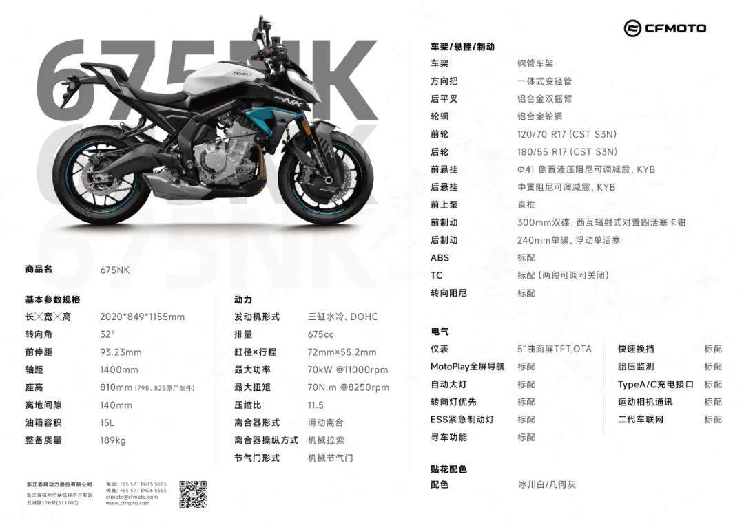 優(yōu)異推重比,閃電出擊:源自全新自研CF675cc動(dòng)力平臺(tái)的675NK急速駛?cè)虢值馈7逯倒β?0kW @11000rpm、峰值扭矩70Nm @8250rpm帶來(lái)強(qiáng)勁性能,在推重比0.37的加持下,提速能力堪比超跑;當(dāng)油門擰動(dòng),音爆轟鳴,藍(lán)色閃電迅速照耀每一個(gè)角落。可控線性動(dòng)力,雷厲風(fēng)行:三缸引擎帶來(lái)天然的線性動(dòng)力,起步勁力十足且加速平穩(wěn),高轉(zhuǎn)亦能穩(wěn)定輸出,不經(jīng)意間便已3秒級(jí)零百,這就是675NK,天生的街頭霸主;源源不斷的動(dòng)力勢(shì)若雷霆回響,綿延不絕,獨(dú)特的三缸聲浪又如驚雷咆哮,暴烈沖刷路人感官,內(nèi)心熱血逐漸升溫。極致輕裝出街,擊潰冗余:搭載重量≤54kg三缸引擎,優(yōu)于同級(jí)水準(zhǔn),同時(shí),在整體零件結(jié)構(gòu)設(shè)計(jì)、車架及輪胎上也做到了極致的輕量化,使得675NK輕易便“瘦”成一道鋒利的閃電,整備質(zhì)量?jī)H為189kg。極致輕裝出街,既有顏值,更具性能!非凡操控大師,游刃毫厘之間街道巷道,絲滑游走:675NK擁有優(yōu)于同級(jí)的1400mm極短軸距,帶來(lái)更為緊湊的整車尺寸,搭配32°轉(zhuǎn)向角設(shè)定有效降低車輛回轉(zhuǎn)半徑,轉(zhuǎn)身收油,單車道/小巷道均可一把調(diào)頭,精準(zhǔn)觸達(dá)每個(gè)角落;跑得快還要?jiǎng)x得住,675NK前制動(dòng)采用雙碟300mm制動(dòng)盤,后制動(dòng)采用單碟240mm制動(dòng)盤,剎停穩(wěn)準(zhǔn)狠,一把捏出撞墻感,強(qiáng)有力的制動(dòng)信心也讓出街更安心;不僅如此,直推上泵制動(dòng)手感非常清晰,心中有數(shù)便能更加收放自如。同時(shí),標(biāo)配鈦尺,在高速時(shí)可以有效降低搖擺風(fēng)險(xiǎn),也能讓每一次出擊更加信心十足。駕馭極限,樂(lè)趣無(wú)邊:得益于前Φ41 倒置液壓阻尼KYB減震及后中置阻尼減震,在前后20段阻尼可調(diào)的設(shè)定下,偏運(yùn)動(dòng)的避震調(diào)校帶來(lái)強(qiáng)有力的支撐性,攻彎下探具備更高極限;無(wú)論山道、街道,還是直道、彎道,675NK都張弛有度,游刃有余。同時(shí),CFMOTO×正新特別調(diào)校的高性能S3N輪胎,采用半熱熔配方,并用不同密度的設(shè)計(jì)分布,提升不同傾角接地感,帶來(lái)更強(qiáng)抓地力的同時(shí)也具備超高耐磨度,牢牢抓地,翹頭、壓彎都不在話下。人機(jī)設(shè)定6/4,可激進(jìn)可舒適