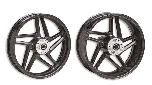 碳纖套件的清單包括五輻式的碳纖維前后輪框,適用于雙座位的版本,與 Panigale V4 S 的鋁合金鍛造車輪輪,其重量減輕了 0.95 公斤,前輪的轉動慣性降低了 12%、后輪的轉動慣性降低了 19%,更輕的車輪讓新車在改變方向時變得更加靈活;套件內還包括了碳纖維制的前、后擋泥板和一對雙層的定風翼,這些碳纖組件強化了 Panigale V4 的賽車風格,并使全車的重量減輕了 1 公斤。