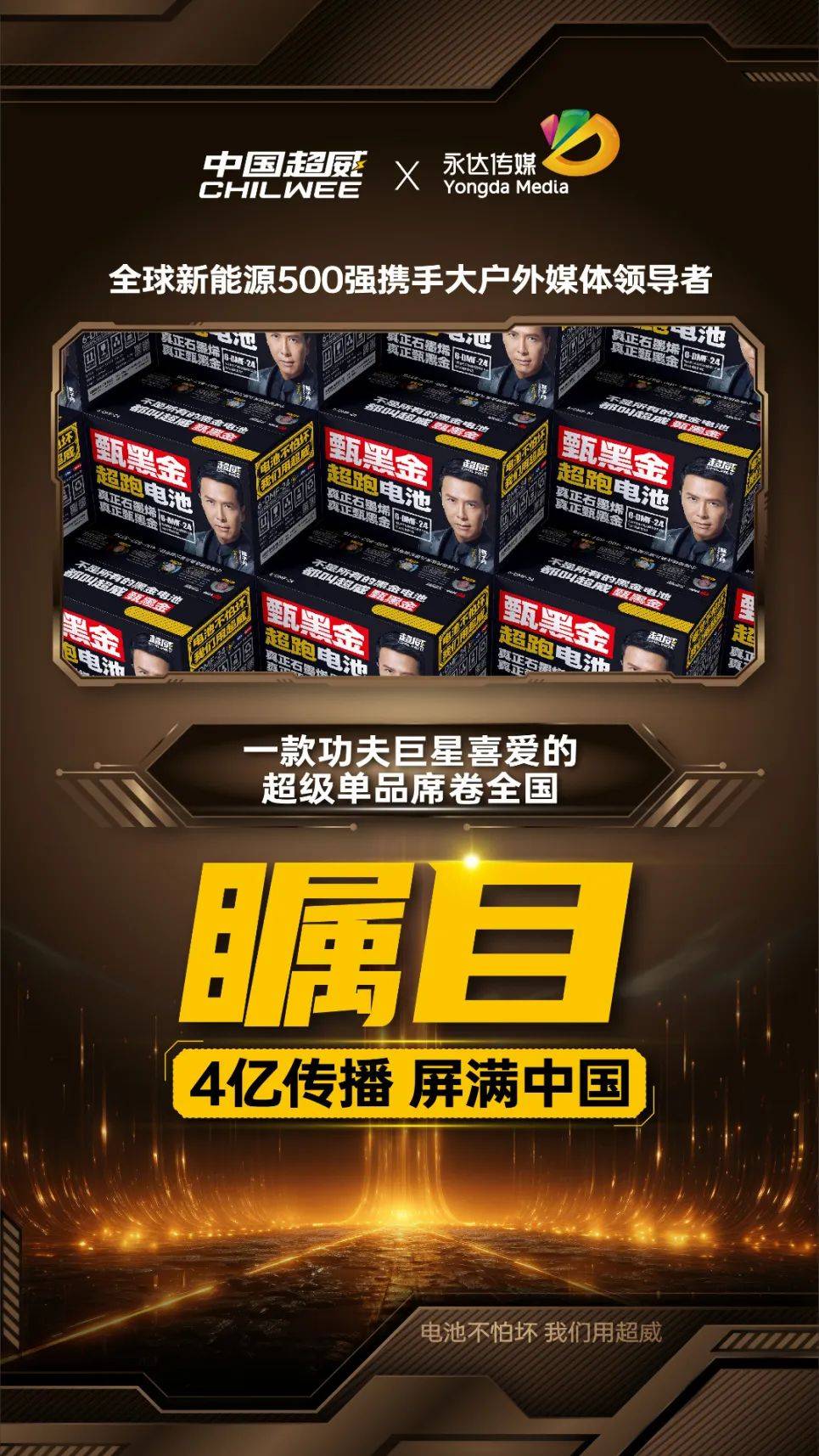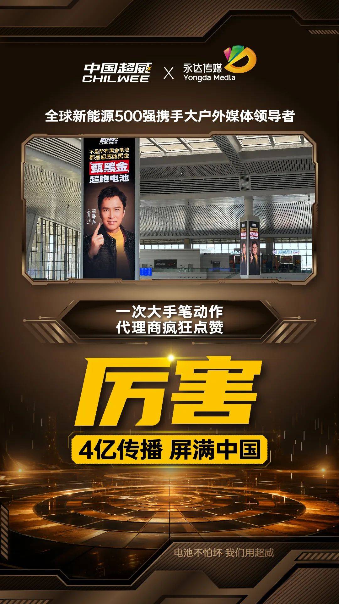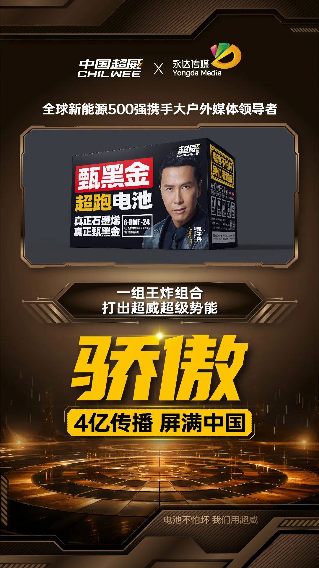 以科技賦能品牌,用創(chuàng)新引領(lǐng)未來(lái),超威集團(tuán)正以強(qiáng)大的品牌力和市場(chǎng)力,向著全球新能源領(lǐng)域的領(lǐng)導(dǎo)地位穩(wěn)步邁進(jìn)。我們相信,超威集團(tuán)與永達(dá)傳媒攜手并肩,定能讓“中國(guó)品牌·超威力量”的聲音,傳遍世界的每一個(gè)角落,讓世界見證超威品牌的力量!