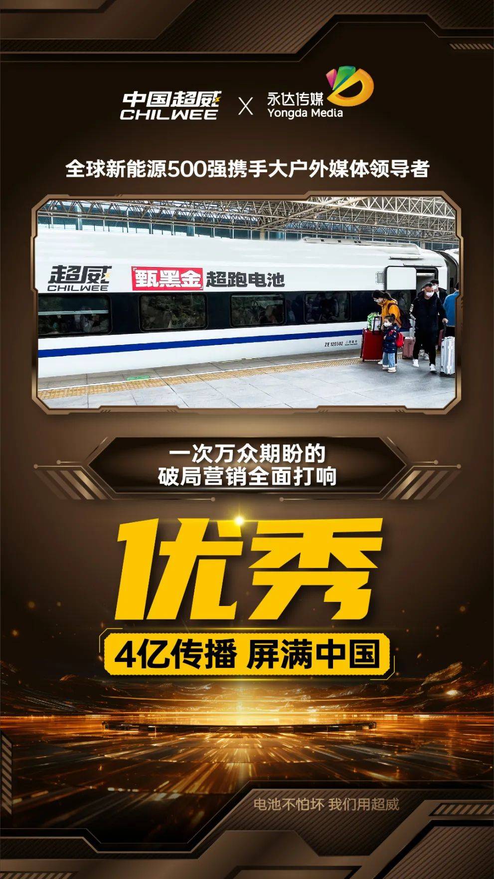 高鐵,作為中國(guó)現(xiàn)代化交通的重要標(biāo)志,匯聚了商旅精英、家庭用戶等高價(jià)值人群,具有客流量大、覆蓋率廣、傳播速度快等優(yōu)勢(shì),是品牌傳播的黃金賽道。此外,高鐵場(chǎng)景自帶的“高端化”“品質(zhì)感”屬性,與超威甄黑金超跑電池的高端定位也形成了天然契合。