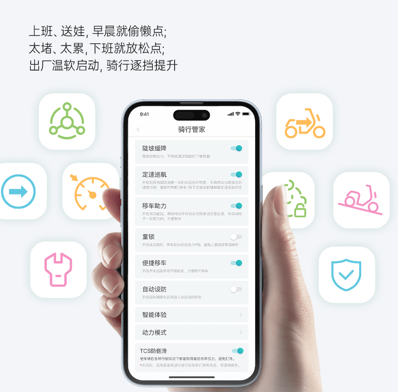 此外,MODA50-Q還擁有綠源為女性用戶量身打造的九大定制化騎行模式,并搭載2025版藍牙智能互聯(lián)系統(tǒng)。能夠?qū)崿F(xiàn)NFC、藍牙無感、APP等多種解鎖方式和移車助力、陡坡緩降、安全童鎖、柔和啟動等實用功能,極為貼合女性用戶的實際用車需求,并具備電池檢測、親屬分享等,軟件方面同樣全面領(lǐng)先。
