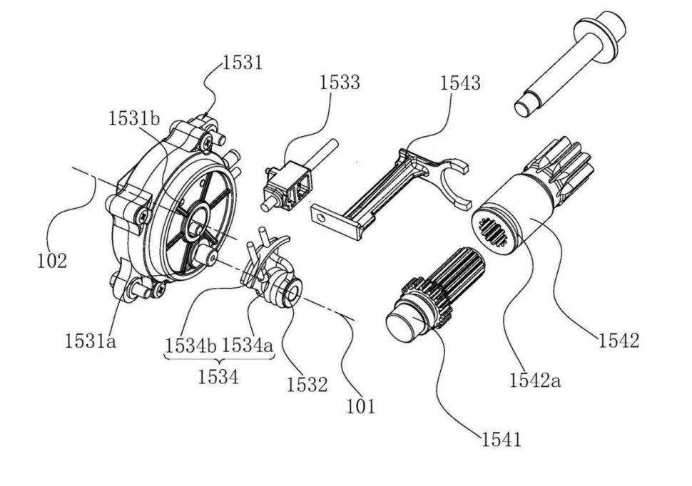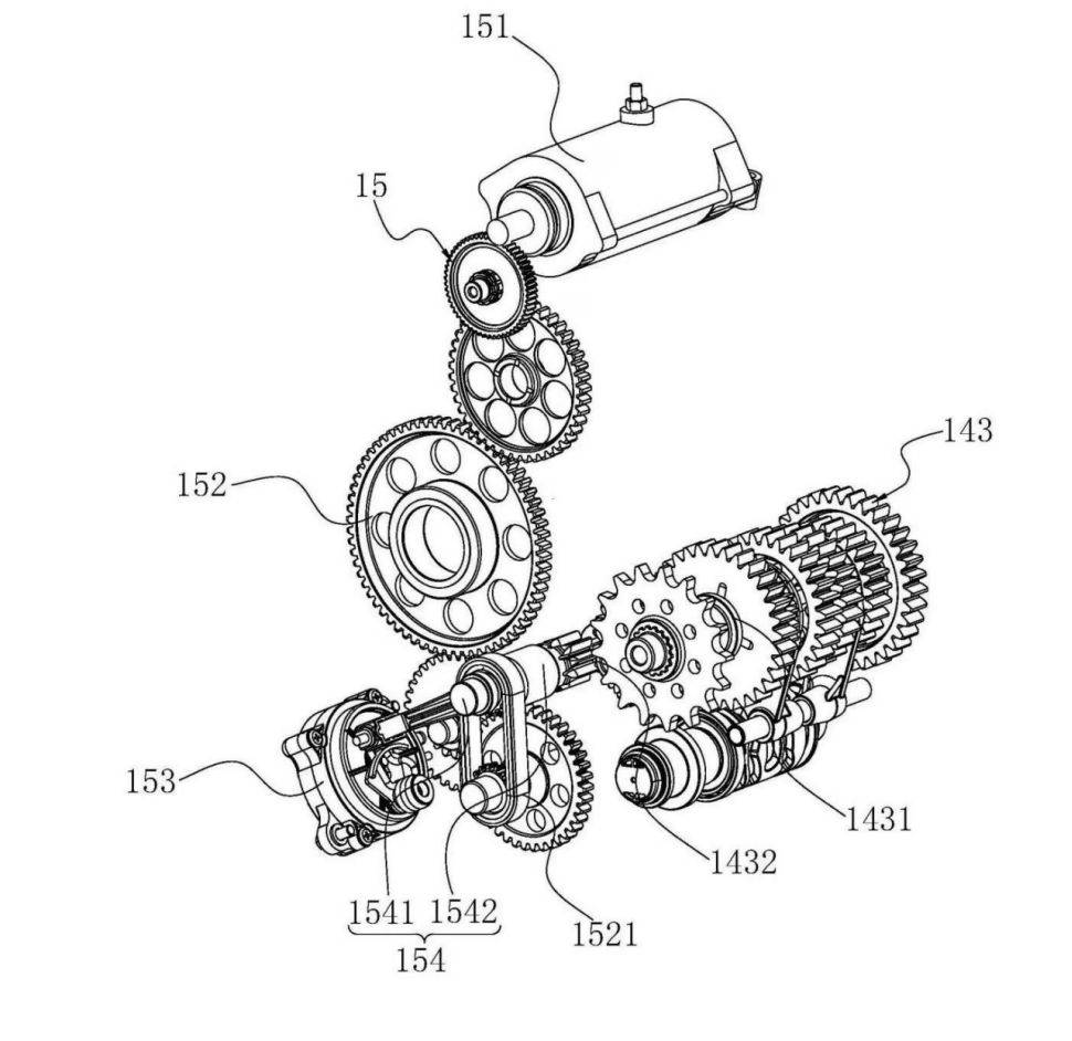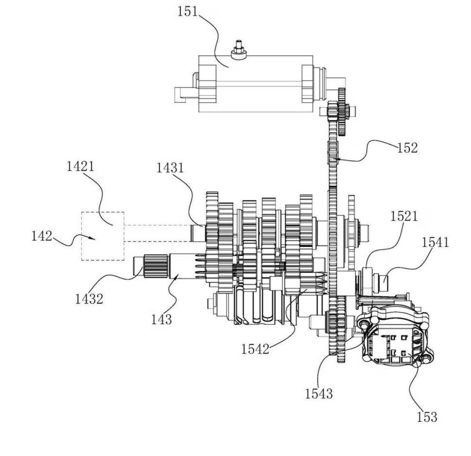 專(zhuān)利曝光:起動(dòng)電機(jī)驅(qū)動(dòng)倒車(chē),結(jié)合電子控制系統(tǒng)根據(jù) 春風(fēng) 提交的專(zhuān)利,1250TR-G 的電動(dòng)倒車(chē)系統(tǒng)是通過(guò)起動(dòng)馬達(dá)驅(qū)動(dòng),與多數(shù)高端旅跑車(chē)型采用的機(jī)制相似。 起動(dòng)馬達(dá)(151 號(hào))位于 V 型引擎的夾角內(nèi),原本僅負(fù)責(zé)啟動(dòng)引擎,如今透過(guò)額外齒輪機(jī)構(gòu)(152 號(hào))與電子作動(dòng)器,可以在特定條件下讓摩托車(chē)倒退。