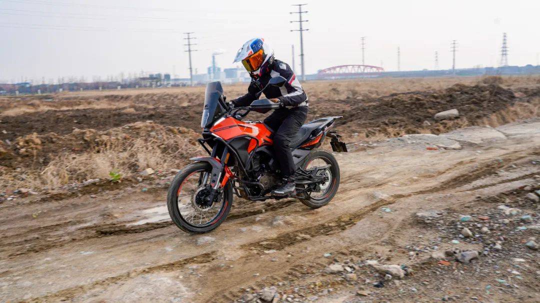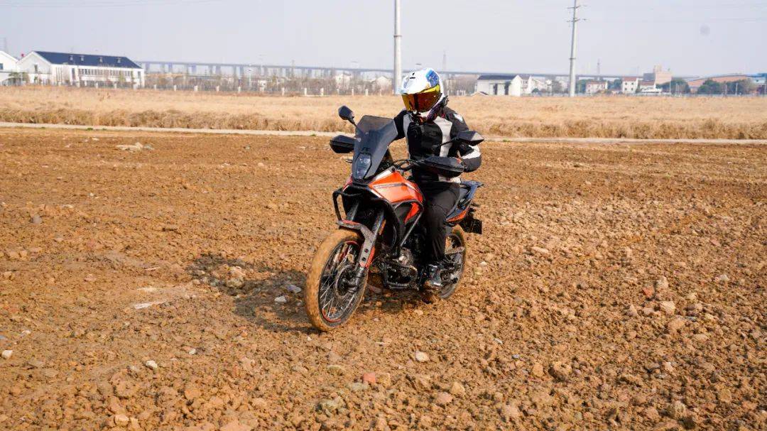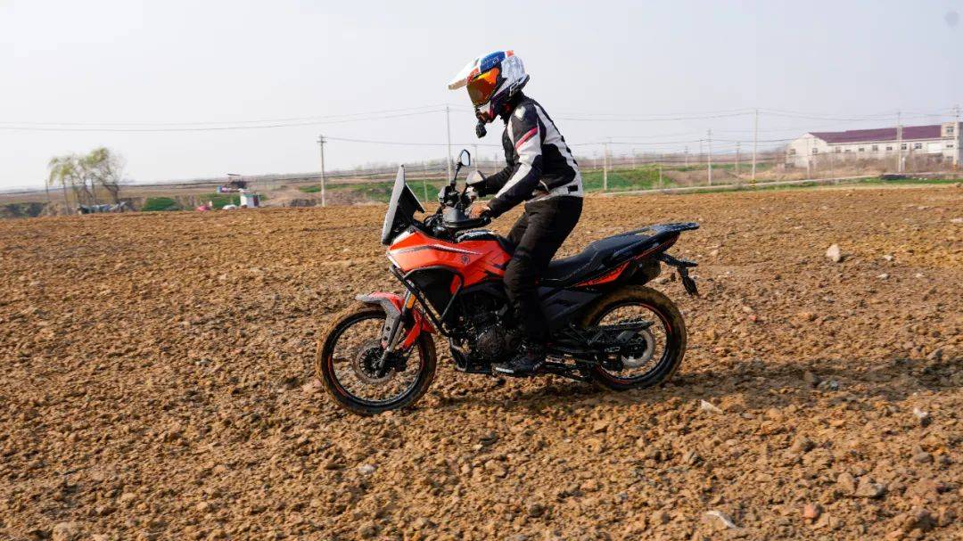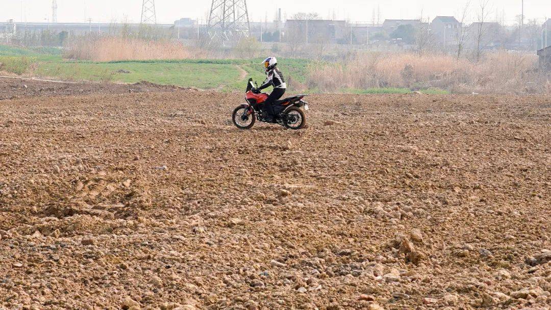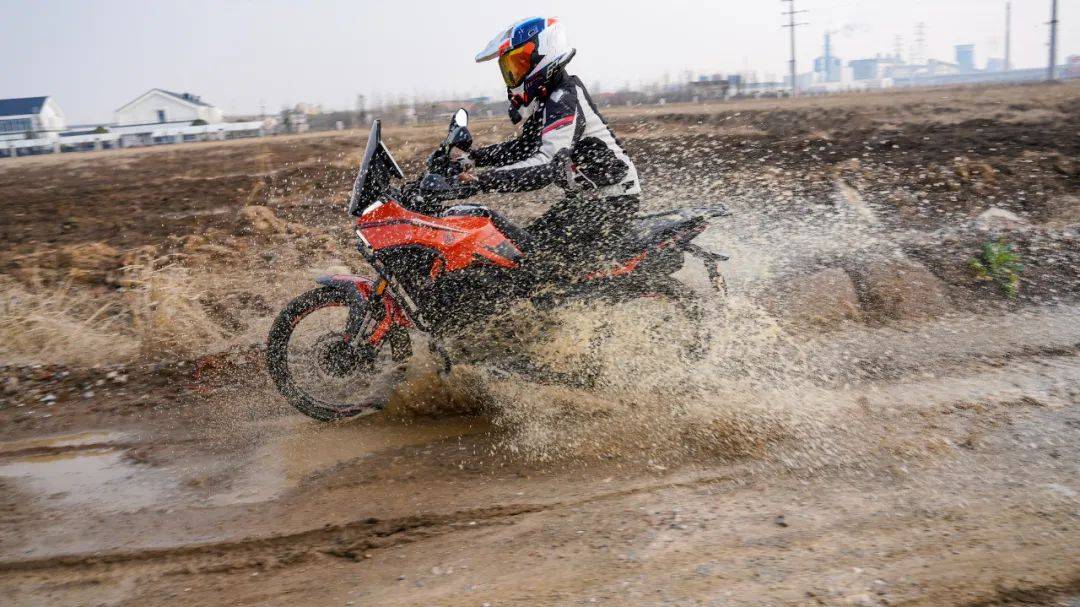 隨后是軟質(zhì)碎土坡, 由于穿越版采用19寸90胎寬的前輪,在充滿大小濕潤(rùn)土塊的浮土坡面上,前輪依然擁有不錯(cuò)的抓地力,但后輪就比較吃力了。越往碎土坡里面騎,濕度越大,很快后輪覆蓋了厚厚的泥巴,行進(jìn)速度明顯遲緩,且站立騎行時(shí)手把左右晃動(dòng)厲害,很消耗體力,但車子依然順利駛出土坡,并沒(méi)有困在里面(跟拍的踏板車剛進(jìn)入幾十米就無(wú)法騎行了)。然后再次進(jìn)入碎土坡又玩了兩圈,才意猶未盡的離開(kāi)。這才是T250X的正確打開(kāi)方式,比公路上好玩得多。非鋪裝體驗(yàn)足以稱得上優(yōu)異,對(duì)T250X的動(dòng)力響應(yīng),高離地間隙帶來(lái)的通過(guò)性,長(zhǎng)避震行程帶來(lái)的穩(wěn)定性以及龜背胎在土石路、軟泥抓地表現(xiàn),完全可以給到90分,堪稱這個(gè)級(jí)別的硬派ADV典范,只有一點(diǎn)需要說(shuō)的是站立騎行時(shí)掛擋桿的平面位置不利于掛擋,最好優(yōu)化下。涉水路自然也少不了,以T250X的硬核屬性,通過(guò)積水泥濘路依然相當(dāng)輕松。我們直接以50km/h左右的速度通過(guò)積水帶,車身穩(wěn)定,前輪輕松破開(kāi)水面,車輪沒(méi)有任何打滑感(此時(shí)關(guān)閉了TCS),濺得水花飛起,反復(fù)多次,感受其通過(guò)性、龜背胎抓地都表現(xiàn)出色,基本能給到90分,表現(xiàn)依然滿意。