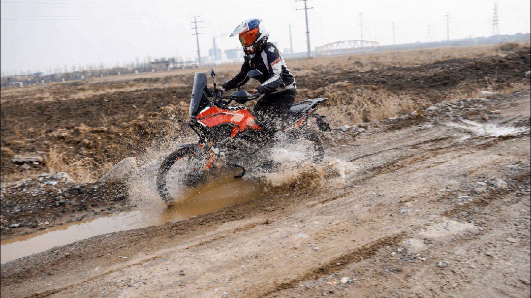 非鋪裝路先來(lái)到坑洼起伏的土石路面,上車前將模式調(diào)整到Touring模式,前后ABS全關(guān),TC長(zhǎng)按關(guān)閉后,我們嘗試用3檔大油門的狀態(tài)通過(guò),此時(shí)時(shí)速可以做到57km/h左右通過(guò),車輛的動(dòng)力響應(yīng)積極,這套長(zhǎng)行程避震器回彈迅速,支撐性能足夠,發(fā)動(dòng)機(jī)底護(hù)板也不會(huì)觸底,車身在較高速度下過(guò)坑洼土石路,能保持穩(wěn)定的姿態(tài),輕松通過(guò),且并不吃力,表現(xiàn)令人滿意。反復(fù)多次通過(guò),均表現(xiàn)得游刃有余。