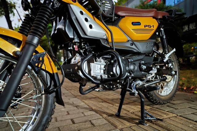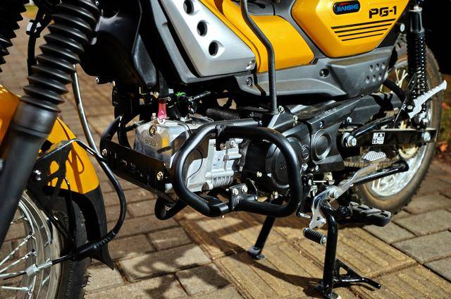 PG-1 搭載一副風(fēng)冷四沖程臥式單氣缸、SOHC 兩氣閥的發(fā)動(dòng)機(jī),缸徑、行程為 50 mm x 57.9 mm,排氣量 114 cc,配備了電子燃油噴注系統(tǒng)、半自動(dòng)離合器、四檔的變速齒輪箱。車體采用了鋼管式的車架,行程為 130 mm 的套筒式正立前叉、行程為 109 mm 的雙筒式后減震,兩件式設(shè)計(jì)的鞍座,前碟、后鼓的制動(dòng)系統(tǒng),直徑為 16 英寸的車輪,容量為 5.1 公升的油箱,標(biāo)配了顆粒表面的越野輪胎,整備重量 107 公斤。