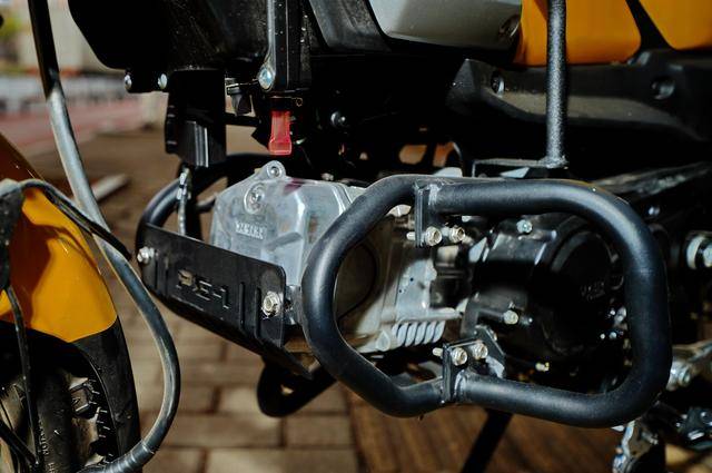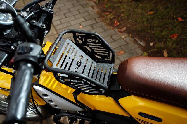 下面的圖片,是加裝了越野風(fēng)格的前護(hù)架、發(fā)動(dòng)機(jī)兩側(cè)護(hù)架、位于車身中部的儲(chǔ)物架、車尾架等組件的 PG-1。一系列的功能化組件,讓全車展現(xiàn)出一個(gè)更加徹底的越野形象。