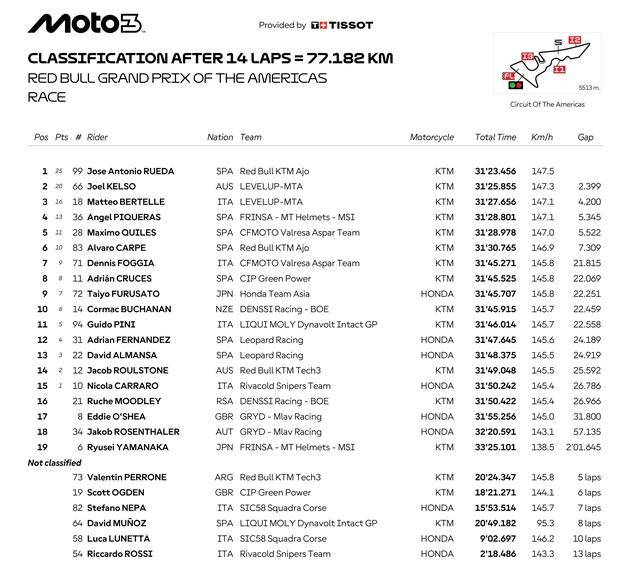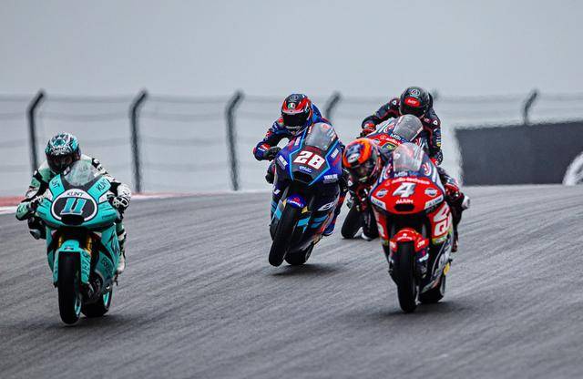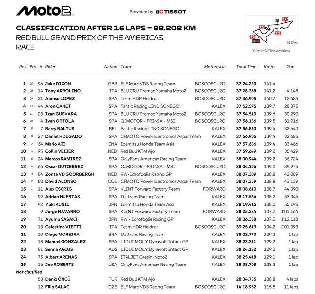 Moto2 級別 16 圈的比賽、冠軍之爭沒有懸念,從排頭位出發(fā)、駕駛著 96 號車的英國車手迪森(Jake Dixon)開場就取得領先,跑完了第 3 圈就已經(jīng)與后車拉開了超過 2 秒的距離。他最終以超過 4 秒的優(yōu)勢輕松奪得了冠軍,繼上一站的阿根廷之后、連續(xù)第二站取得勝利。