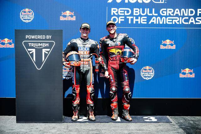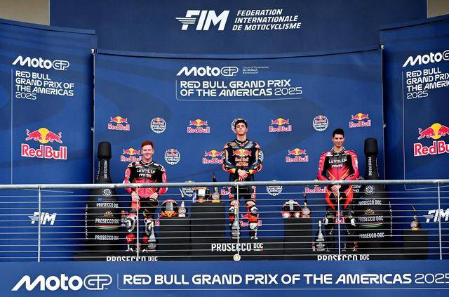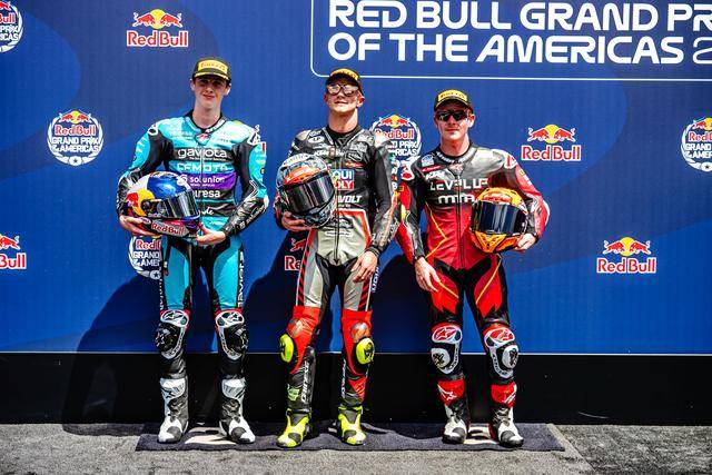 后面,駕駛 14 號車意大利車手阿博里諾(Tony Arbolino)獲得亞軍,21 號車西班牙車手洛佩茲(AlonsoLopez)拿到了季軍。美國站的 Moto2 頒獎臺,由意大利底盤/車架供應商 Boscoscuro 博斯科斯庫羅所占據(jù)。