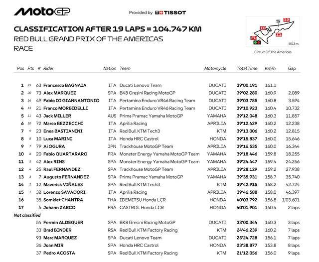帶頭者的摔車,讓在第 4 圈的時候就已經(jīng)超越了小馬昆斯進占第二位的巴納亞、借此升上第一;在接下來的比賽里,巴納亞的位置沒有受到威脅、順利奪得了冠軍,拿到了 2025 賽季的首場勝利;小馬昆斯獲得了第二,連續(xù)第三站拿到亞軍;吉南托里奧獲得了季軍,在新賽季首次登上了頒獎臺。2025 新賽季開賽以來、杜卡迪連續(xù)三站統(tǒng)治了頒獎臺。