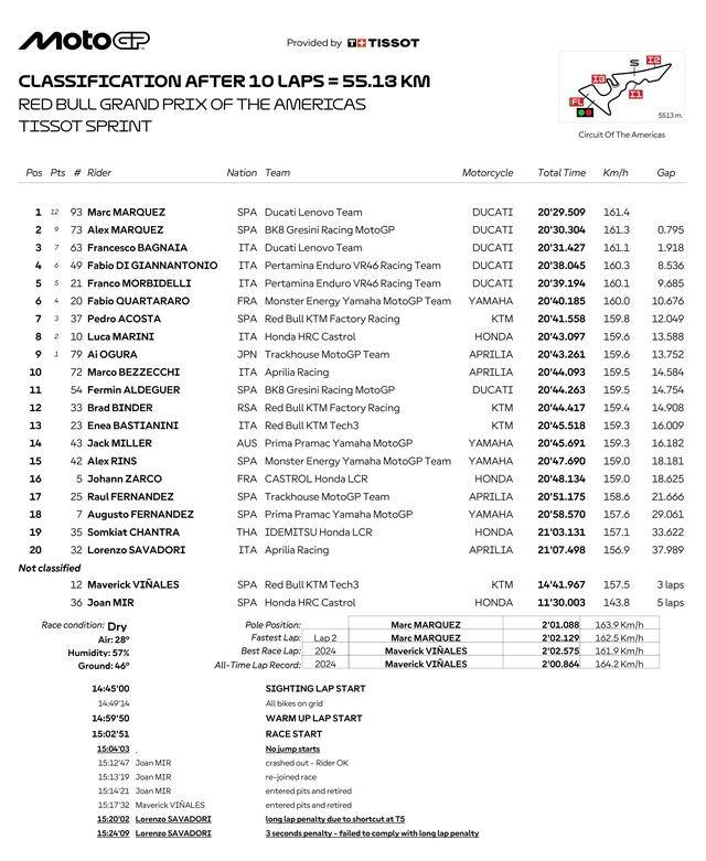 賽程為 10 圈的 Sprint沖刺賽、整個過程沒有太多的波瀾,正式起跑后不久、馬昆斯兄弟倆就 “ 控制了大局 ”,到第 3 圈結束時、兩人已拉開了與后車的距離。最終,馬昆斯順利奪得了沖刺賽的冠軍,小馬昆斯落后哥哥不到 0.8 秒獲得了第二,63 號車的巴納亞(Francesco Bagnaia)拿到了第三、落后頭車接近 2 秒。