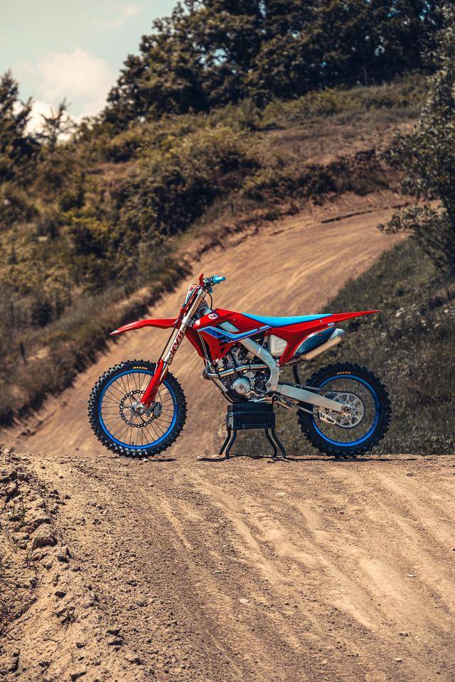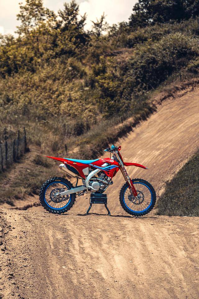除了紅色的車身圖案,TM 標(biāo)志性的藍(lán)色、也用于鞍座和前輪車輪,從而讓該系列的 2025 夢想限量版既帶有最初的色彩、也有著近現(xiàn)代的元素。而全部限量版車型均采用了鋁合金制的雙翼樑式車架,則是 TM 在全尺寸越野賽車?yán)锩娴臉?biāo)志。
