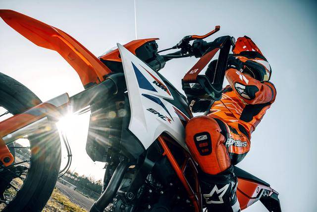 5、通過細長的前部外殼組件和非常緊湊的、容量為 9 公升的油箱,讓新的 125 SMC R 和 390 SMC R 實現(xiàn)了一個纖薄、緊湊的車身輪廓,該設(shè)計不僅減小了整體寬度,而且在發(fā)生摔倒意外時、也保護了油箱,同時也優(yōu)化了駕駛員在公路/越野不同騎行風(fēng)格時的人體工程學(xué) —— 不論是站立騎行、還是進行壓彎動作時;