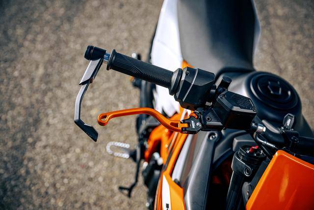 7、電子輔助控制系統(tǒng),兩個車型均采用了電控油門。390 版本標(biāo)配了可選的騎行模式,默認的模式設(shè)置為 Street 街道,追求更激進騎行風(fēng)格的騎士、也可以將模式切換到 Sport 運動模式,對應(yīng)該系統(tǒng)的 MTC 牽引力控制系統(tǒng)也可以完全關(guān)閉。此外,兩個車型均配備了雙通道的 ABS。對于 390 版本的 ABS,如果將騎行模式切換到運動模式時,那么騎士還可以在三種不同的 ABS 模式(Road 公路、Supermoto 或 Supermoto +)之間進行選擇;