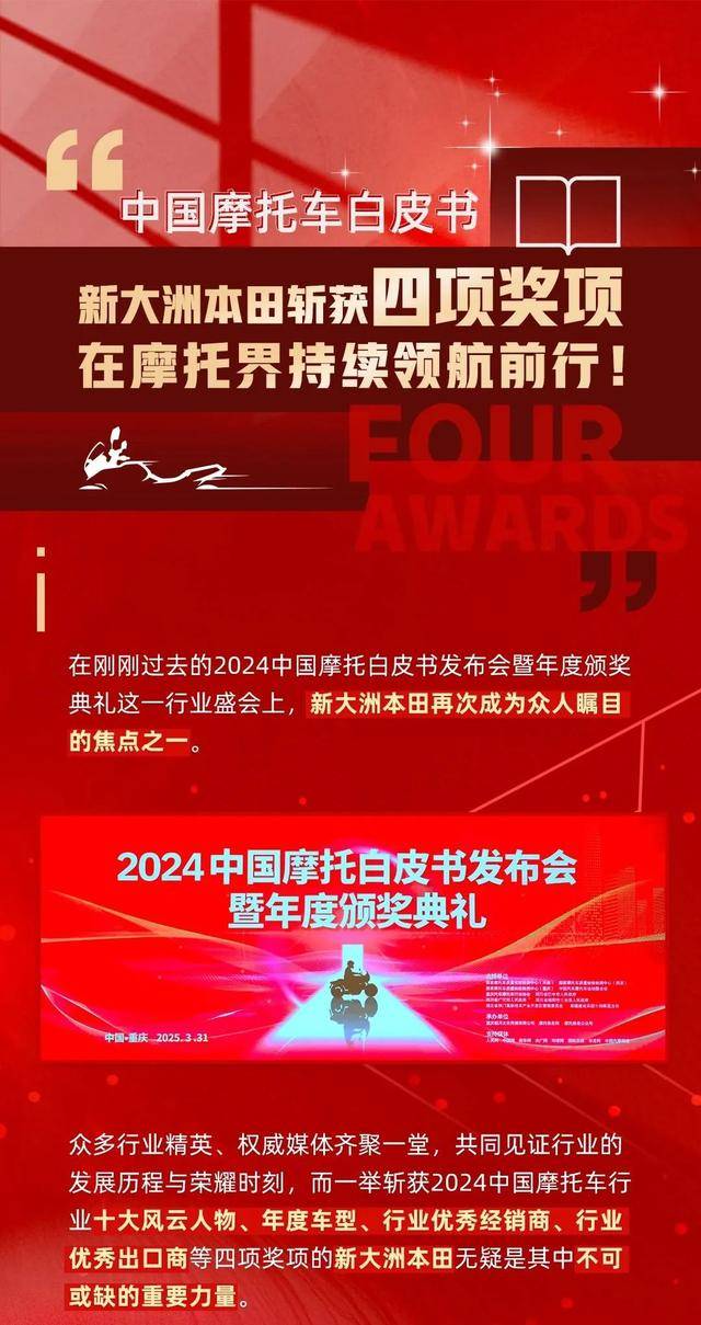 核心提示:中國摩托車白皮書:新大洲本田斬獲四項(xiàng)獎項(xiàng),在摩托界持續(xù)領(lǐng)航前行!