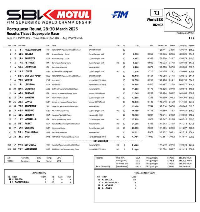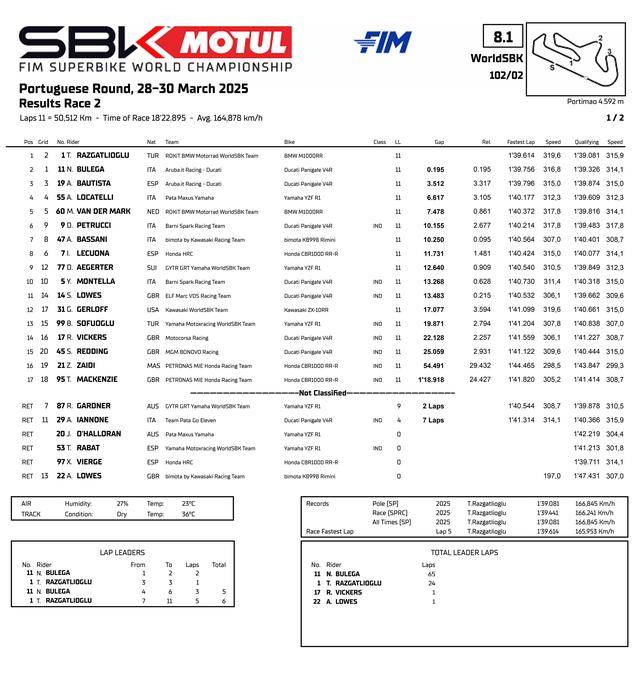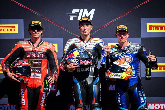最終,拉格里奧盧拿下了第二節(jié)比賽的勝利,在葡萄牙站獲得了全勝,同時(shí)也拿到了他在 WorldSBK 里的第六十場(chǎng)勝利;布雷加再次以些微的 0.195 秒差距、屈居第二,他的隊(duì)友捌弟獲得了第三。