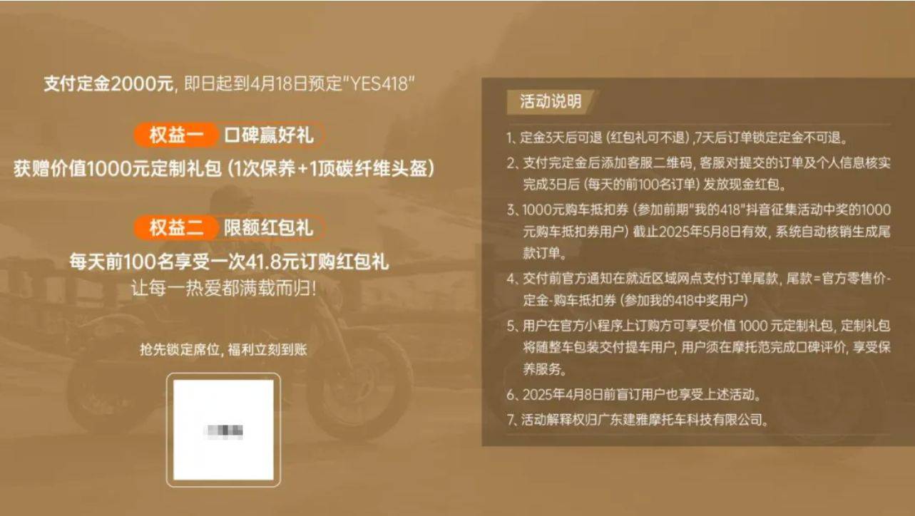 即日起至4月18日,用戶支付2000元定金即可享價值千元定制禮包及每日限額紅包禮兩大權益,針對前期參與“我的418”抖音征集,活動中獎用戶,還可享受1000元購車抵扣劵。
