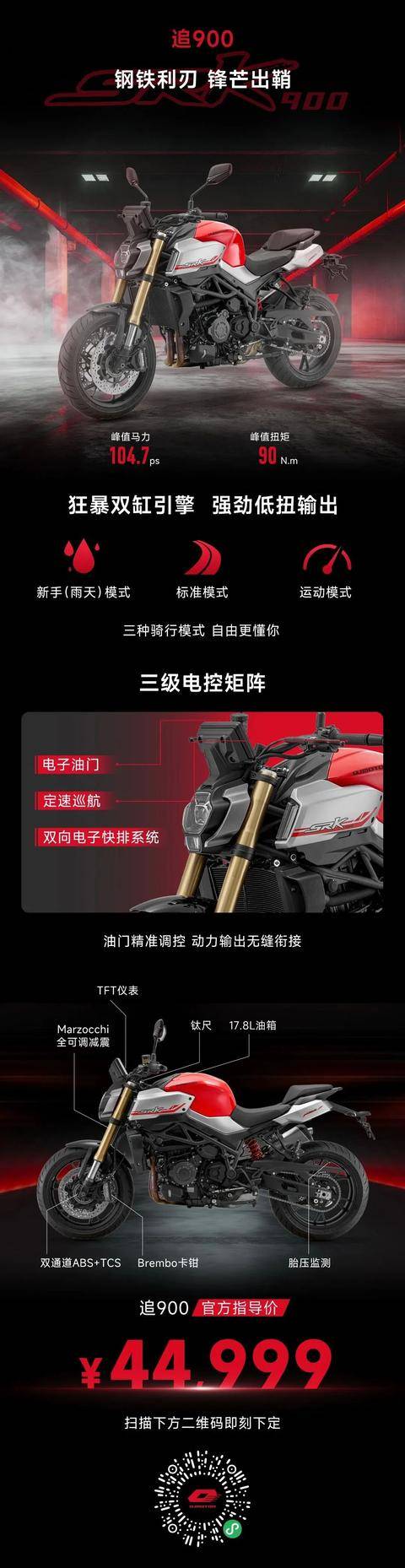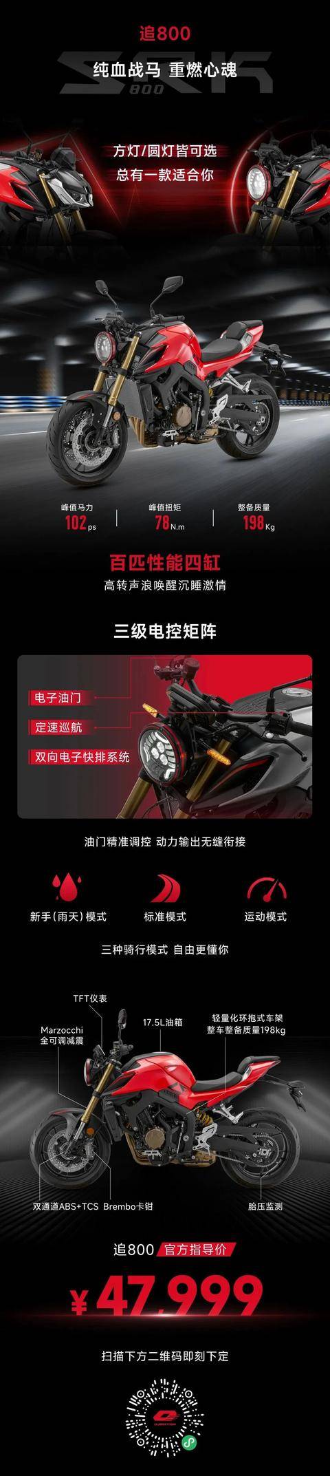 顯然,錢江仍在延續(xù)著“車海戰(zhàn)術”的老套路,但本屆摩展上大家對其評價卻基本保持“正面”,鮮見“套娃”之類的評論。原因呢?很簡單一一此番錢江的產(chǎn)品的確不是換湯不換藥的“新”,而是由里及外的新。12款新車,貨真價實。譬如賽800RS一一全鋁一體式雙翼梁車架,輕量化(202公斤)車身+大馬力(126Ps)的強悍推重比,以及單向電子快排、雙通道ABS+TCS等同類車中最高端的配置,再加上5萬以內的售價,真的很讓人心動!