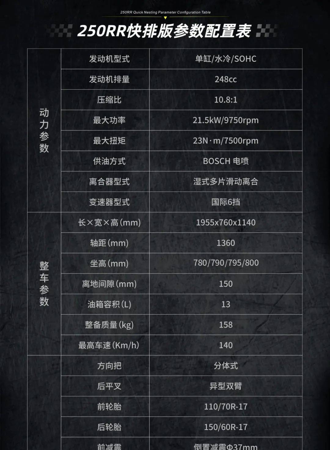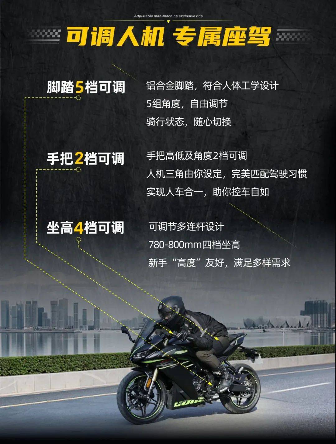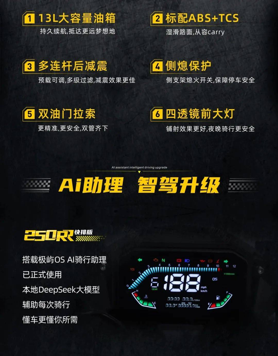 無極雖然沒有參加本次北京摩展,但活不停,今天發(fā)布了250RR快排版,增加了單向快排,同時也接入了極嶼OS AI騎行助理,擁有本地DEEPSEEK大模型支持,人機(jī)對話更懂你,加量不加價,依然15499元。無極250RR另一大特色就是高度可調(diào)的人機(jī)設(shè)計(jì),腳踏五檔可調(diào)、手把2檔可調(diào)、座高從780到800四檔可調(diào),適應(yīng)更廣泛身高、腿長、手長的騎士。發(fā)動機(jī)配備依然是隆鑫單缸水冷四氣門動力, 博世電噴,最大功率21.5千瓦/9750轉(zhuǎn),最大扭矩23牛米/7500轉(zhuǎn)。其他配置保持不變,主要有雙通道ABS+TCS、前300毫米單盤對四活塞卡鉗,后單活塞卡鉗,不銹鋼排氣、液晶儀表、T-BOX車聯(lián)網(wǎng)、側(cè)熄保護(hù)、13L大容量油箱、多連桿后減震、四透鏡前大燈、鋁合金主/副擱腳、雙油門拉索。作為入門級仿賽,升級了單向快排和AI騎行助理的250RR,更好騎,對新手更友好。