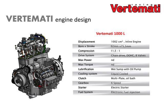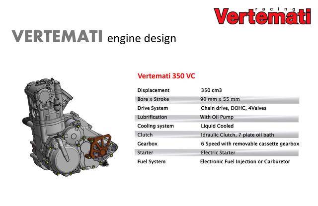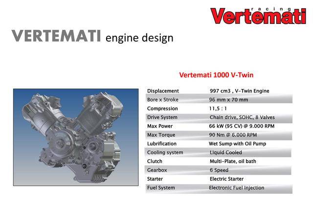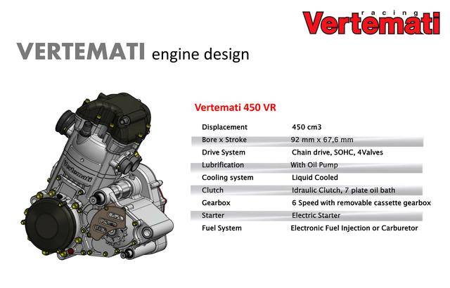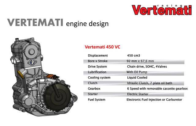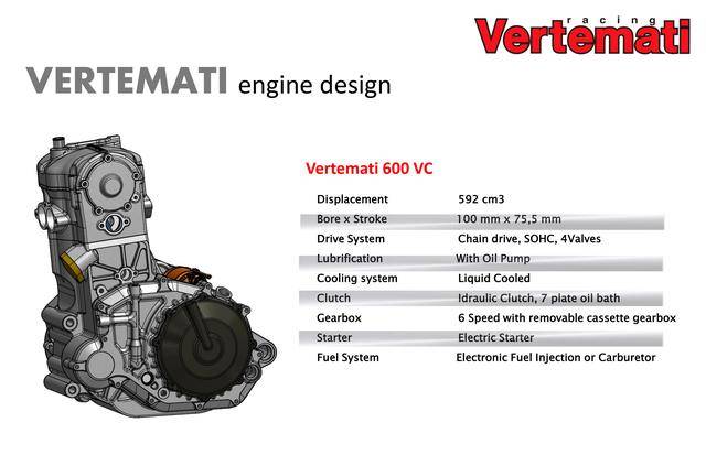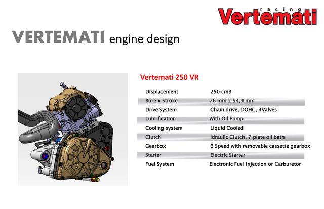 * 采用反向后傾式單氣缸布局的 VR 系列,有維特馬蒂 250 VR(DOHC 四氣閥)、維特馬蒂 350 VR(DOHC 四氣閥)、維特馬蒂 450 VR(SOHC 四氣閥)、維特馬蒂 600 VR(SOHC 四氣閥),共四個不同排氣量版本。車隊用來參加 S1GP 的 NV450(Nicot Vertemati 450)賽車,就是搭載 VR 系列的發(fā)動機(jī);