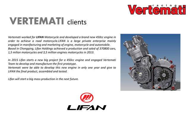維特馬蒂公司創(chuàng)立于上世紀(jì)的六十年代,最初的業(yè)務(wù)是為部分的海外制造商設(shè)計、開發(fā)競技級組件;近年來的核心業(yè)務(wù),是高性能發(fā)動機(jī)以至是整車的研究、開發(fā)和配套服務(wù)。該公司曾為包括中國制造商在內(nèi)的多個客戶、設(shè)計過高性能的單氣缸發(fā)動機(jī),此外也曾制作過多款具意大利風(fēng)格的概念車、在 EICMA 米蘭車展亮相。