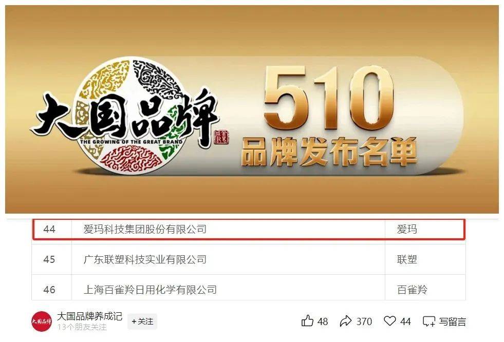 于此同時(shí),在中國(guó)品牌日這一國(guó)家品牌戰(zhàn)略的標(biāo)志性節(jié)點(diǎn)中,《大國(guó)品牌》510品牌名單重磅發(fā)布,愛瑪位列“中國(guó)可持續(xù)品牌100”名單第44名,以品牌長(zhǎng)遠(yuǎn)發(fā)展理念與社會(huì)責(zé)任擔(dān)當(dāng),成為綠色智造領(lǐng)域的標(biāo)桿。