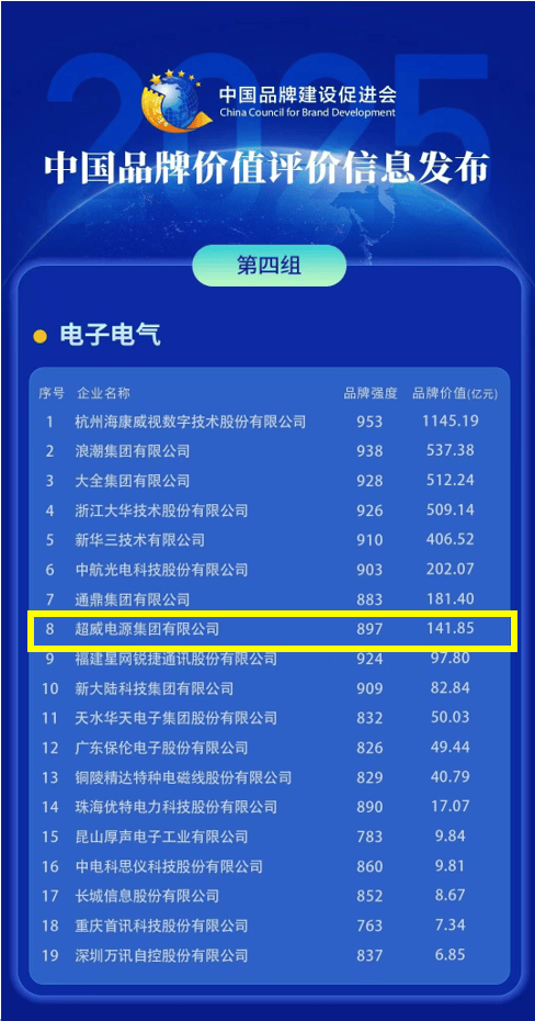 ? 超威集團(tuán)榮登“2025中國品牌價(jià)值評(píng)價(jià)信息”榜單電子電氣組第8名,位列電池行業(yè)第一