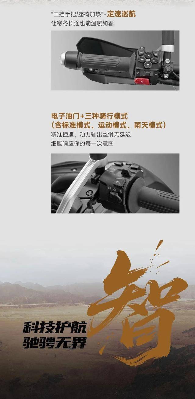 安全配置方面,博世雙通道ABS+可關(guān)閉TCS牽引力控制系統(tǒng)成為標(biāo)配,Brembo對向四活塞卡鉗搭配SUNSTAR浮動(dòng)碟盤。新增的定速巡航功能,則讓長途摩旅的疲勞感大幅降低。三擋可調(diào)加熱手把與加熱坐墊,讓零下環(huán)境騎行溫暖如春。