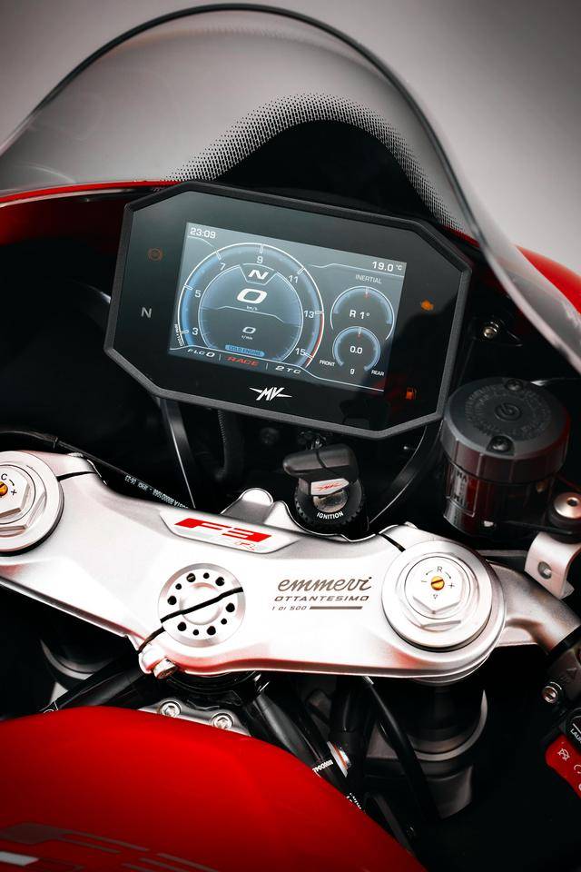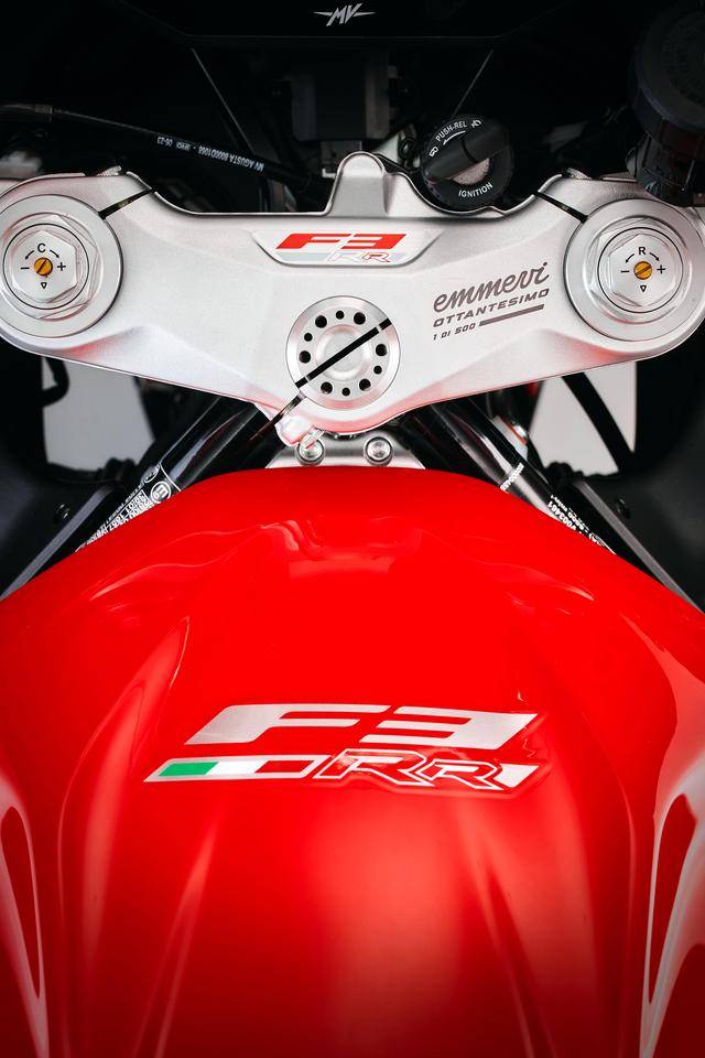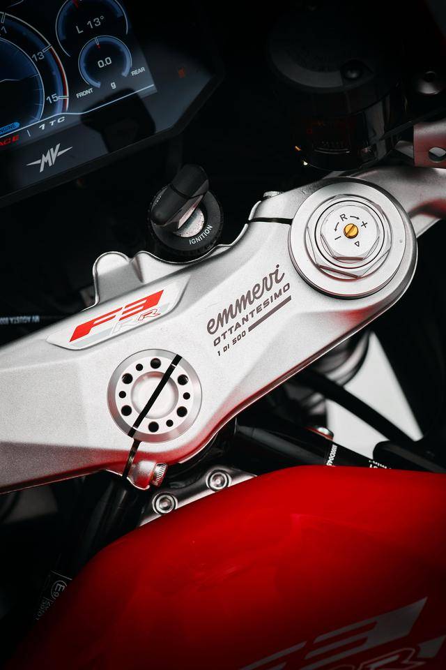 整個 2025 八十周年紀(jì)念版系列包括六個車型:搭載直列三氣缸發(fā)動機(jī)的中量級運動街車Brutale RR Ottantesimo、Dragster RR Ottantesimo,復(fù)古跑車 Superveloce S Ottantesimo,中型跑車 F3 RR Ottantesimo;以及搭載直列四氣缸發(fā)動機(jī)的旗艦級運動街車 Brutale 1000 Ottantesimo、Brutale 1000 RR Ottantesimo。上述六個車型均各限量生產(chǎn) 500 輛。作為限量版的紀(jì)念車型,六個車型的上三星(上前叉三角臺)都有激光打刻的 emmevi OTTANTESIMO 字樣和每輛車的紀(jì)念編號,emmevi 是 MV 的意大利語拼音,而 Ottantesimo 意大利語 “ 八十 ” 的意思。