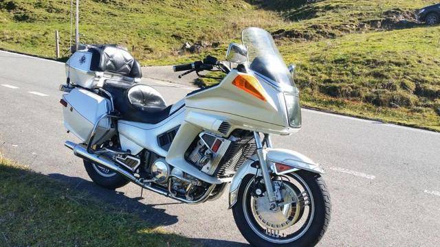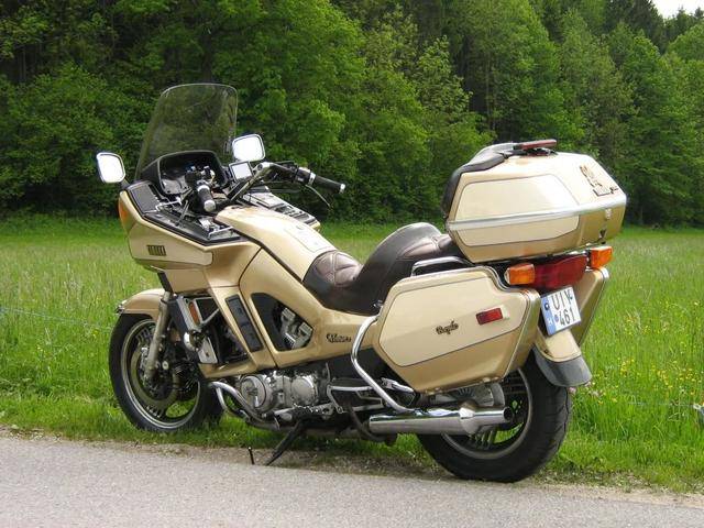 金翼率先開(kāi)辟了大型豪華旅行摩托車市場(chǎng)。當(dāng)然,市場(chǎng)是敏感的,就在金翼漸入佳境之際,競(jìng)爭(zhēng)隨之而來(lái),同行們敏銳地捕捉到市場(chǎng)的商機(jī),意識(shí)到這是一塊“大蛋糕”,因而加緊研發(fā)豪華旅行車,以爭(zhēng)搶市場(chǎng)份額。其中,雅馬哈迅速跟進(jìn),在1983年推出了Venture Royale,武裝了一臺(tái)水冷、70°夾角 V型四缸發(fā)動(dòng)機(jī),排量達(dá)到1198mL,比本田金翼多了113mL。而且,這臺(tái)V型四缸發(fā)動(dòng)機(jī)的技術(shù)含量比金翼更高,采用了雙頂置凸輪軸16氣門的汽缸頭,在4只等真空米尼庫(kù)化油器的配合下,能夠爆發(fā)67kW的最大功率,強(qiáng)大的動(dòng)力讓體重340kg的Venture Royale迅猛加速,0-400米加速只需13秒左右,終點(diǎn)速度167km/h,比金翼來(lái)得兇猛。Venture Royale同樣定位于豪華旅行車,V型四缸運(yùn)轉(zhuǎn)平靜安穩(wěn)、扭矩充沛,適合滿載輜重長(zhǎng)途跋涉,在最高擋以100km/h速度行駛時(shí),轉(zhuǎn)速只有3400r/min;動(dòng)力儲(chǔ)備豐沛,長(zhǎng)時(shí)間高速奔馳效能不衰減,極速可達(dá)220km/h;20升的大容積油箱支持長(zhǎng)途續(xù)航,加滿油后可以行駛360千米;裝備了空氣調(diào)節(jié)的懸掛系統(tǒng),40mm的前叉還具備防俯沖功能,再加上座位寬大舒適,車把、乘客腳踏板等都可以調(diào)節(jié),能夠讓騎手減輕疲勞;而且,寬敞的行李箱、CB天線、大型擋風(fēng)板等長(zhǎng)途配置一應(yīng)俱全,可謂是競(jìng)爭(zhēng)力十足!