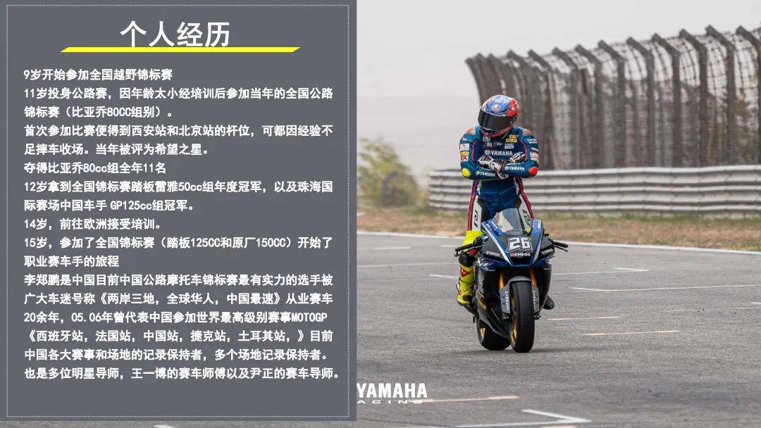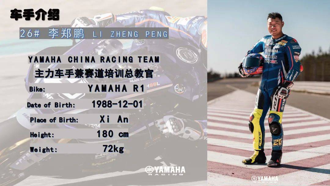 26號李鄭鵬是現(xiàn)役中國多個場地1000cc最快圈速紀(jì)錄的保持者,被廣大車迷譽為“兩岸三地,全球華人,中國最速”。 在20余年的賽道生涯中,李鄭鵬身經(jīng)百戰(zhàn),榮譽等身,曾代表中國征戰(zhàn)世界頂級賽事MotoGP 250cc組別,他在傳道授業(yè)上也頗有建樹,多年來他擔(dān)任多位知名明星車手的導(dǎo)師。他的加入,將為雅馬哈中國賽車隊注入強勁動力。