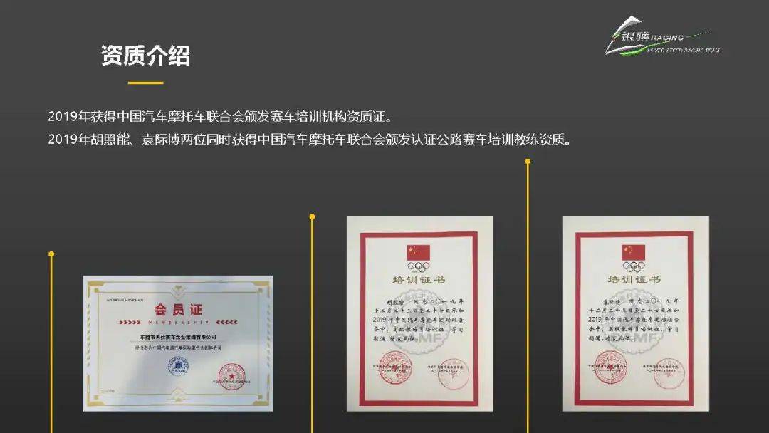 車隊由東莞市銀驥賽車活動策劃有限公司運營,于2020年獲得中汽摩聯官方頒發(fā)的賽車培訓機構資質證書,為中國摩托車賽事新生力量的培育注入堅實力量。