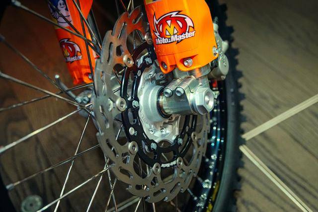車體采用一副鋼制的車架、鋁合金制的后搖臂,WP 配套的懸掛系統(tǒng),前面是 XACT Pro 7548 倒立式前叉、后面是 XACT Pro 7750 后減震;CNC 制的上下三星(前叉三角臺),車頭的前部整流罩針對空氣動力學而設計,碳纖維制的輕量化導航塔臺,LED 作為光源的前大燈;三個油箱的設計,總共可攜帶大約 34.5 公升的燃料,其中帶外部容量刻度的主油箱、其容量為 16 公升,兩個副油箱的容量分別為 9 公升、9.5 公升;前 21、后 18 英寸直徑的輪框,Brembo布雷博的前后剎車卡鉗、Galfer 的波浪式前后剎車碟;標配了發(fā)動機底部的大型護罩、Scotts 的轉(zhuǎn)向阻尼器。