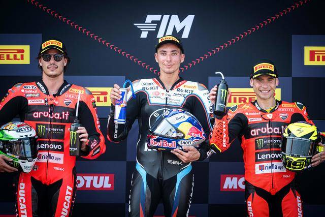 在后面目睹了碰撞、駕駛 1 號(hào)車的土耳其車手拉格里奧盧(Toprak Razgatlioglu),最終輕松奪得了這場(chǎng)短途賽的第一;后面,駕駛 22 號(hào)車的英國(guó)車手洛維斯(Alex Lowes)落后 4 秒多、拿到了第二,為 Bimota 比摩塔自 2000 年以來(lái)、重新擠進(jìn)三甲的位置;駕駛 55 號(hào)車的意大利車手洛卡泰利(Andrea Locatelli)獲得了第三。