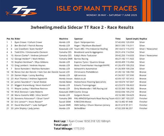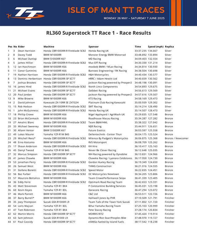 下面的圖片,依次為 Supertwin TT 超級雙缸組、Supersport TT 組、Superstock TT 組、Superbike TT 組以及 Sidecar TT 組的賽事成績。